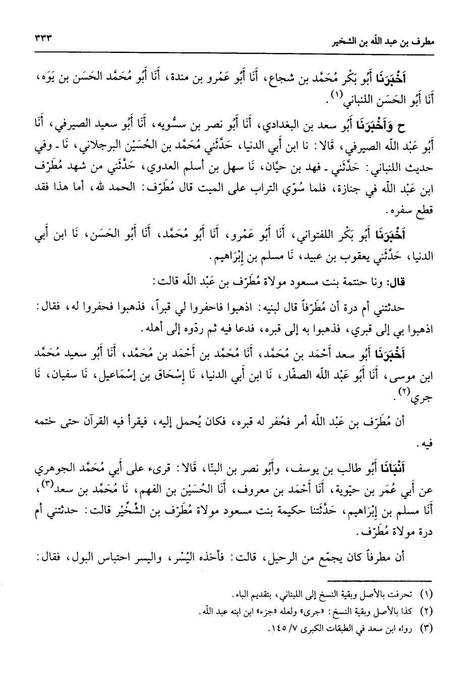 أخبرنا أبو بكر محمد بن شجاع أنا أبو عمرو بن مندة أنا أبو محمد الحسن بن يوه أنا أبو الحسن اللنباني (1) ح وأخبرنا أبو سعد بن البغداداي أنا أبو نصر بن سسويه أنا أبو سعيد الصيرفي أنا أبو عبد الله الصيرفي قالا نا ابن أبي الدنيا حدثني محمد بن الحسين البرجلاني نا وفي حديث اللنباني حدثني فهد بن حيان نا سهل بن أسلم العدوي حدثني من شهد مطرف ابن عبد الله في جنازة فلما سوي التراب على الميت قال مطرف الحمد لله أما هذا فقد قطع سفره أخبرنا أبو بكر اللفتواني أنا أبو عمرو أنا أبو محمد أنا أبو الحسن نا ابن أبي الدنيا حدثني يعقوب بن عبيد نا مسلم بن إبراهيم قال ونا حنتمة بنت مسعود مولاة مطرف بن عبد الله قالت حدثتني أم درة أن مطرفا قال لبنيه اذهبوا فاحفوا لي قبرا فذهبوا فحفروا له فقال اذهبوا بي إلى قبري فذهبوا به إلى قبره فدعا فيه ثم ردوه إلى أهله أخبرنا أبو سعد أحمد بن محمد أنا محمد بن أحمد بن محمد أنا أبو سعيد محمد ابن موسى أنا أبو عبد الله الصفار نا ابن أبي الدنيا نا إسحاق بن إسماعيل نا سفيان نا جري (2) أن مطرف بن عبد الله أمر فحفر له قبره فكان يحمل إليه فيقرأ فيه القران حتى ختمه فيه أنبأنا أبو طالب بن يوسف وأبو نصر بن البنا قالا قرئ على أبي محمد الجوهري عن أبي عمر بن حيوية أنا أحمد بن معروف أنا الحسين بن الفهم نا محمد بن سعد (3) أنا مسلم بن إبراهيم حدثتنا حكيمة بنت مسعود مولاة مطرف بن الشخير قالت حدثتني أم درة مولاة مطرف أن مطرفا كان يجمع من الرحيل قالت فأخذه اليسر واليسر احتباس البول فقال