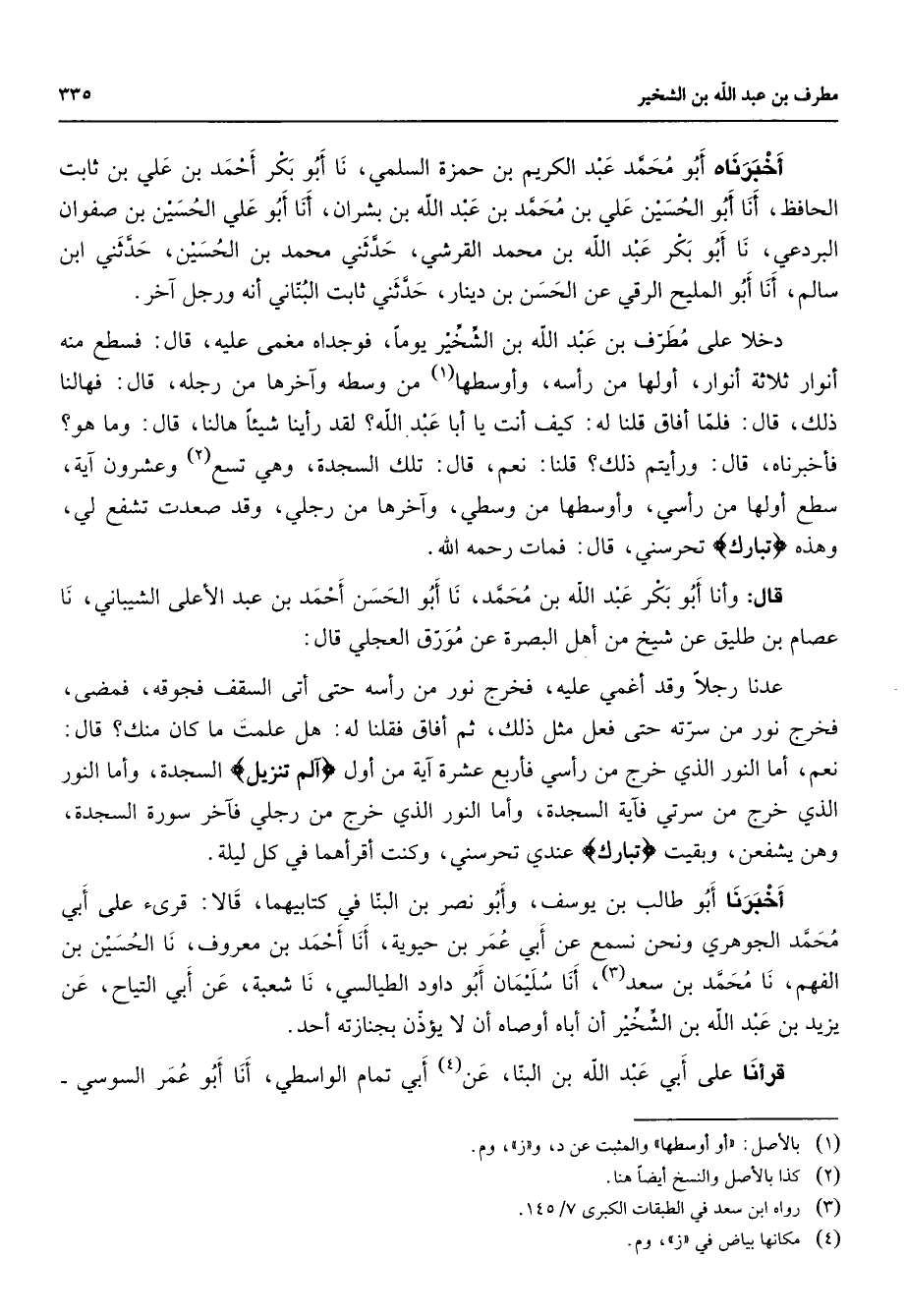 أخبرناه أبو محمد عبد الكريم بن حمزة السلمي نا أبو بكر أحمد بن علي بن ثابت الحافظ أنا أبو الحسين علي بن محمد بن عبد الله بن بشران أنا أبو علي الحسين بن صفوان البردعي نا أبو بكر عبد الله بن محمد القرشي حدثني محمد بن الحسين حدثني ابن سالم أنا أبو المليح الرقي عن الحسن بن دينار حدثني ثابت البناني أنه ورجل آخر دخلا على مطرف بن عبد الله بن الشخير يوما فوجداه مغمى عليه قال فسطع منه أنوار ثلاثة أنوار أولها من رأسه وأوسطها (1) من وسطه وآخرها من رجله قال فهالنا ذلك قال فلما أفاق قلنا له كيف أنت يا أبا عبد الله لقد رأينا شيئا هالنا قال وما هو فأخبرناه قال ورأيتم ذلك قلنا نعم قال تلك السجدة وهي تسع (2) وعشرون آية سطع أولها من رأسي وأوسطها من وسطي وآخرها من رجلي وقد صعدت تشفع لي وهذه " تبارك " تحرسني قال فمات رحمه الله قال وأنا أبو بكر عبد الله بن محمد نا أبو الحسن أحمد بن عبد الأعلى الشيباني نا عصام بن طليق عن شيخ من أهل البصرة عن مورق العجلي قال عدنا رجلا وقد أغمي عليه فخرج نور من رأسه حتى أتى السقف فجوقه فمضى فخرج نور من سرته حتى فعل مثل ذلك ثم أفاق فقلنا له هل علمت ما كان منك قال نعم أما النور الذي خرج من رأسي فأربع عشرة آية من أول " آلم تنزيل " السجدة وأما النور الذي خرج من سرتي فآية السجدة وأما النور الذي خرج من رجلي فآخر سورة السجدة وهن يشفعن وبقيت " تبارك " عندي تحرسني وكنت أقرأهما في كل ليلة أخبرنا أبو طالب بن يوسف وأبو نصر بن البنا في كتابيهما قالا قرئ على أبي محمد الجوهري ونحن نسمع عن أبي عمر بن حيوية أنا أحمد بن معروف نا الحسين بن الفهم نا محمد بن سعد (3) أنا سليمان أبو داود الطيالسي نا شعبة عن أبي التياح عن يزيد بن عبد الله بن الشخير أن أباه أوصاه أن لا يؤذن بجنازته أحد قرأنا على أبي عبد الله بن البنا عن (4) أبي تمام الواسطي أنا أبو عمر السوسي
