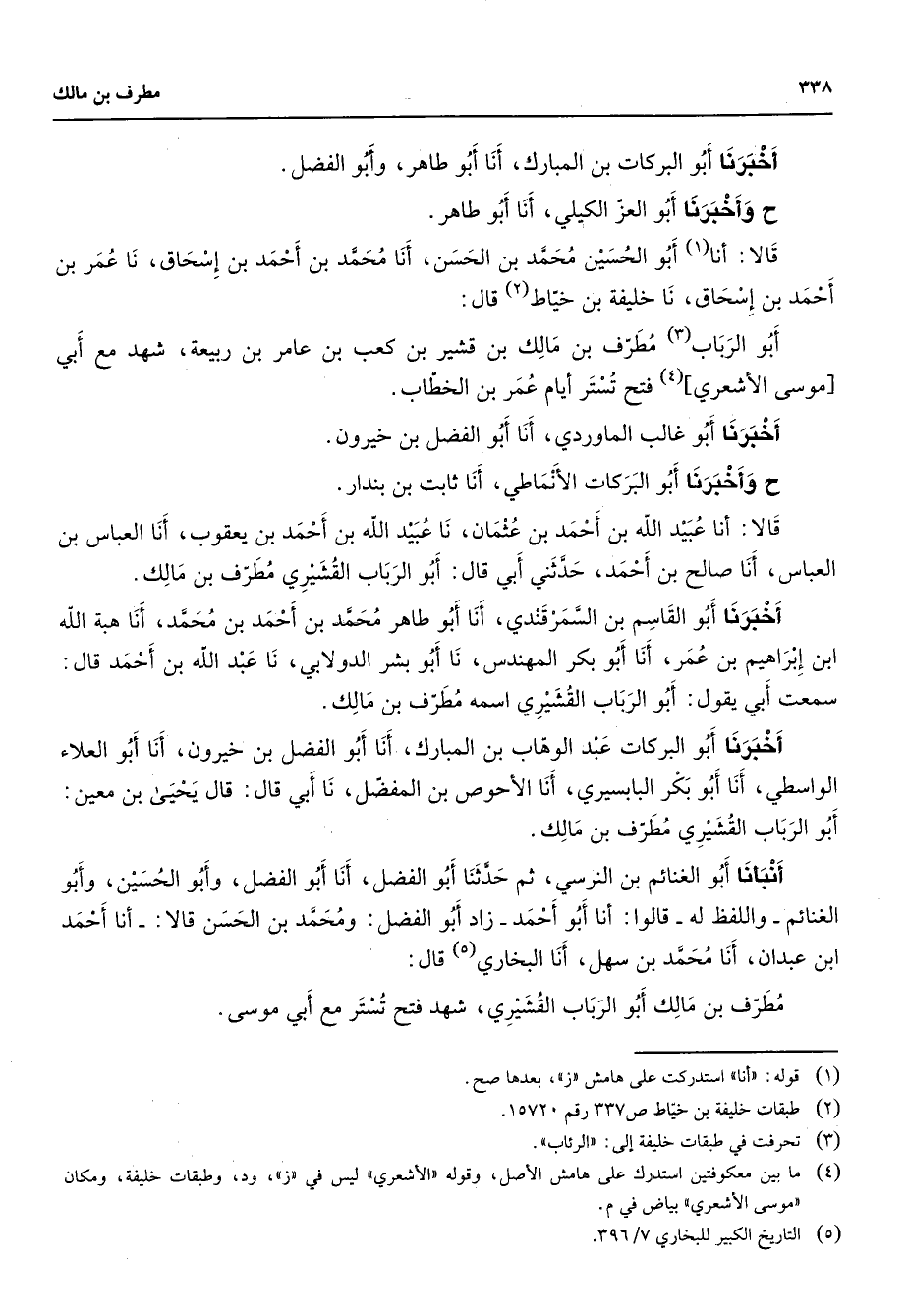 أخبرنا أبو البركات بن المبارك أنا أبو طاهر وأبو الفضل ح وأخبرنا أبو العز الكيلي أنا أبو طاهر قالا أنا (1) أبو الحسين محمد بن الحسن أنا محمد بن أحمد بن إسحاق نا عمر بن أحمد بن إسحاق نا خليفة بن خياط (2) قال أبو الرباب (3) مطرف بن مالك بن قشير بن كعب بن عامر بن ربيعة شهد مع أبي موسى الأشعري (4) فتح تستر أيام عمر بن الخطاب أخبرنا أبو غالب الماوردي أنا أبو الفضل بن خيرون ح وأخبرنا أبو البركات الأنماطي أنا ثابت بن بندار قالا أنا عبيد الله بن أحمد بن عثمان نا عبيد الله بن أحمد بن يعقوب أنا العباس بن العباس أنا صالح بن أحمد حدثني أبي قال أبو الرباب القشيري مطرف بن مالك أخبرنا أبو القاسم بن السمرقندي أنا أبو طاهر محمد بن أحمد بن محمد أنا هبة الله ابن إبراهيم بن عمر أنا أبو بكر المهندس نا أبو بشر الدولابي نا عبد الله بن أحمد قال سمعت أبي يقول أبو الرباب القشيري اسمه مطرف بن مالك أخبرنا أبو البركات عبد الوهاب بن المبارك أنا أبو الفضل بن خيرون أنا أبو العلاء الواسطي أنا أبو بكر البابسيري أنا الأحوص بن المفضل نا أبي قال قال يحيى بن معين أبو الرباب القشيري مطرف بن مالك أنبأنا أبو الغنائم بن النرسي ثم حدثنا أبو الفضل أنا أبو الفضل وأبو الحسين وأبو الغنائم واللفظ له قالوا أنا أبو أحمد زاد أبو الفضل ومحمد بن الحسن قالا أنا أحمد ابن عبدان أنا محمد بن سهل أنا البخاري (5) قال مطرف بن مالك أبو الرباب القشيري شهد فتح تستر مع أبي موسى