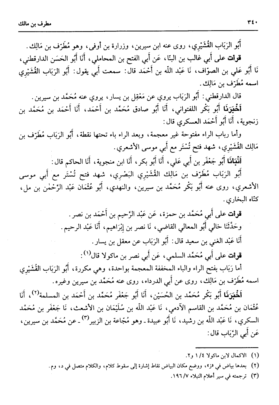 أبو الرباب القشيري روى عنه ابن سيرين وزرارة بن أوفى وهو مطرف بن مالك قرأت على أبي غالب بن البنا عن أبي الفتح بن المحاملي أنا أبو الحسن الدارقطني نا أبو علي بن الصواف نا عبد الله بن أحمد قال سمعت أبي يقول أبو الرباب القشيري اسمه مطرف بن مالك قال الدارقطني أبو الرباب يروي عن معقل بن يسار يروي عنه محمد بن سيرين أخبرنا أبو بكر اللفتواني أنا أبو صادق محمد بن أحمد أنا أحمد بن محمد بن زنجوية أنا أبو أحمد العسكري قال وأما رباب الراء مفتوحة غير معجمة وبعد الراء باء تحتها نقطة أبو الرباب مطرف بن مالك القشيري شهد فتح تستر مع أبي موسى الأشعري أنبأنا أبو جعفر بن أبي علي أنا أبو بكر أنا ابن منجوية أنا الحاكم قال أبو الرباب مطرف بن مالك القشيري البصري شهد فتح تستر مع أبي موسى الأشعري روى عنه أبو بكر محمد بن سيرين والنهدي أبو عثمان عبد الرحمن بن مل كناه البخاري قرأت على أبي محمد بن حمزة عن عبد الرحيم بن أحمد بن نصر وحدثنا خالي أبو المعالي القاضي نا نصر بن إبراهيم أنا عبد الرحيم أنا عبد الغني بن سعيد قال أبو الرباب عن معقل بن يسار قرأت على أبي محمد السلمي عن أبي نصر بن ماكولا قال (1) أما رباب بفتح الراء والباء المخففة المعجمة بواحدة وهي مكررة أبو الرباب القشيري اسمه مطرف بن مالك روى عن أبي الدرداء روى عنه محمد بن سيرين وغيره أخبرنا أبو بكر محمد بن الحسين أنا أبو جعفر محمد بن أحمد بن المسلمة (2) أنا عثمان بن محمد بن القاسم الآدمي نا عبد الله بن سليمان بن الأشعث نا جعفر بن محمد السكري نا عبد الله بن رشيد نا أبو عبيدة وهو مجاعة بن الزبير (3) عن محمد بن سيرين عن أبي الرباب قال