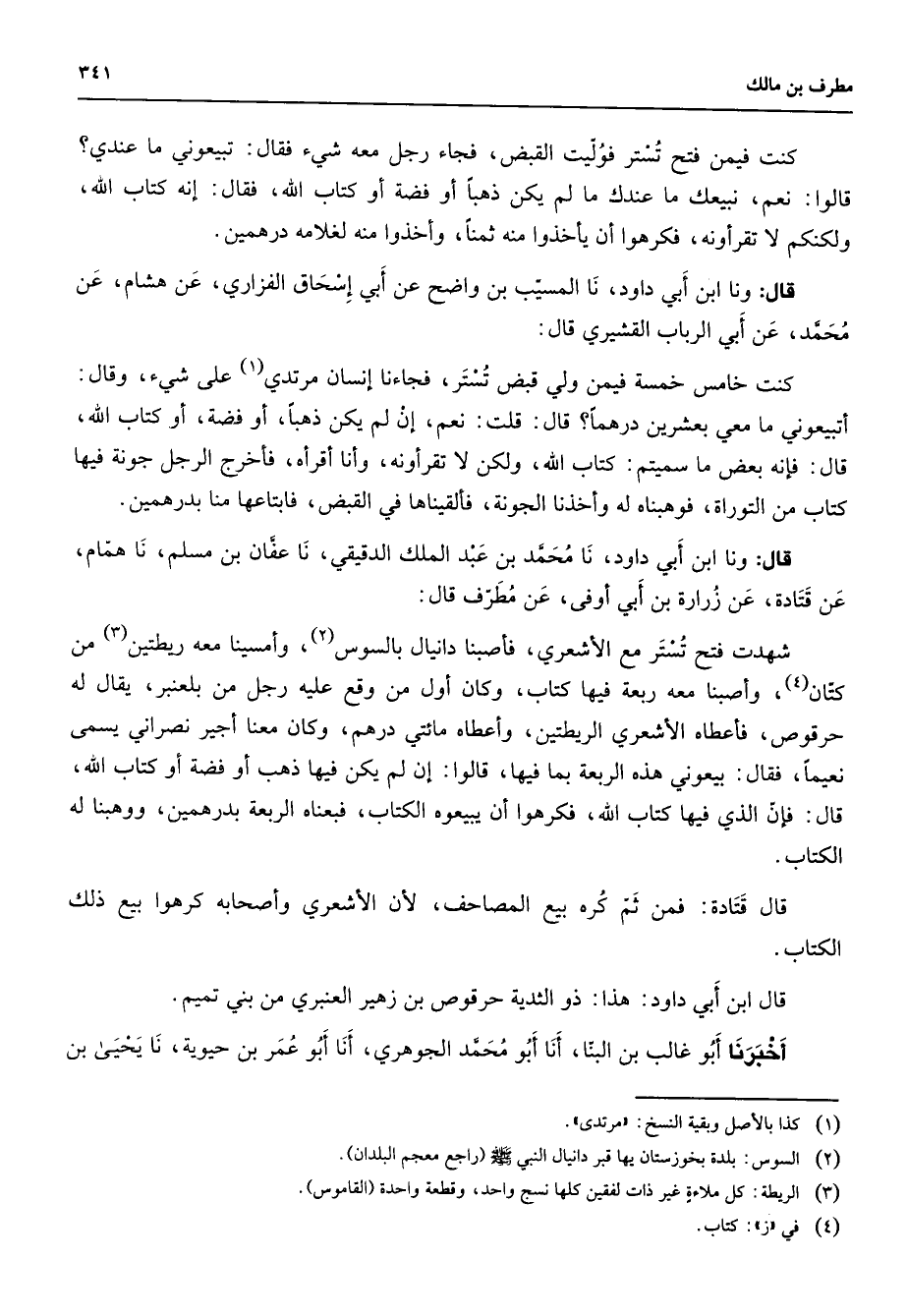 كنت فيمن فتح تستر فوليت القبض فجاء رجل معه شئ فقال تبيعوني ما عندي قالوا نعم نبيعك ما عندك ما لم يكن ذهبا أو فضة أو كتاب الله فقال إنه كتاب الله ولكنكم لا تقرأونه فكرهوا أن يأخذوا منه ثمنا وأخذوا منه لغلامه درهمين قال ونا ابن أبي داود نا المسيب بن واضح عن أبي إسحاق الفزاري عن هشام عن محمد عن أبي الرباب القشيري قال كنت خامس خمسة فيمن ولي قبض تستر فجاءنا إنسان مرتدي (1) على شئ وقال أتبيعوني ما معي بعشرين درهما قال قلت نعم إن لم يكن ذهبا أو فضة أو كتاب الله قال فإنه بعض ما سميتم كتاب الله ولكن لا تقرأونه وأنا أقرأه فأخرج الرجل جونة فيها كتاب من التوراة فوهبناه له وأخذنا الجونة فألقيناها في القبض فابتاعها منه بدرهمين قال ونا ابن أبي داود نا محمد بن عبد الملك الدقيقي نا عفان بن مسلم نا همام عن قتادة عن زرارة بن أبي أوفى عن مطرف قال شهدت فتح تستر مع الأشعري فأصبنا دانيال بالسوس (2) وأمسينا معه ريطتين (3) من كتان (4) وأصبنا معه ربعة فيها كتاب وكان أول من وقع عليه رجل من بلعنبر يقال له حرقوص فأعطاه الأشعري الريطتين وأعطاه مائتي درهم وكان معنا أجير نصراني يسمى نعيما فقال بيعوني هذه الربعة بما فيها قالوا إن لم يكن فيها ذهب أو فضة أو كتاب الله قال فإن الذي فيها كتاب الله فكرهوا أن يبيعوه الكتاب فبعناه الربعة بدرهمين ووهبنا له الكتاب قال قتادة فمن ثم كره بيع المصاحف لأن الأشعري وأصحابه كرهوا بيع ذلك الكتاب قال ابن أبي داود هذا ذوالثدية حرقوص بن زهير العنبري من بني تميم أخبرنا أبو غالب بن البنا أنا أبو محمد الجوهري أنا أبو عمر بن حيوية نا يحيى بن (1) كذا بالاصل وبقية النسخ: " مرتدى "