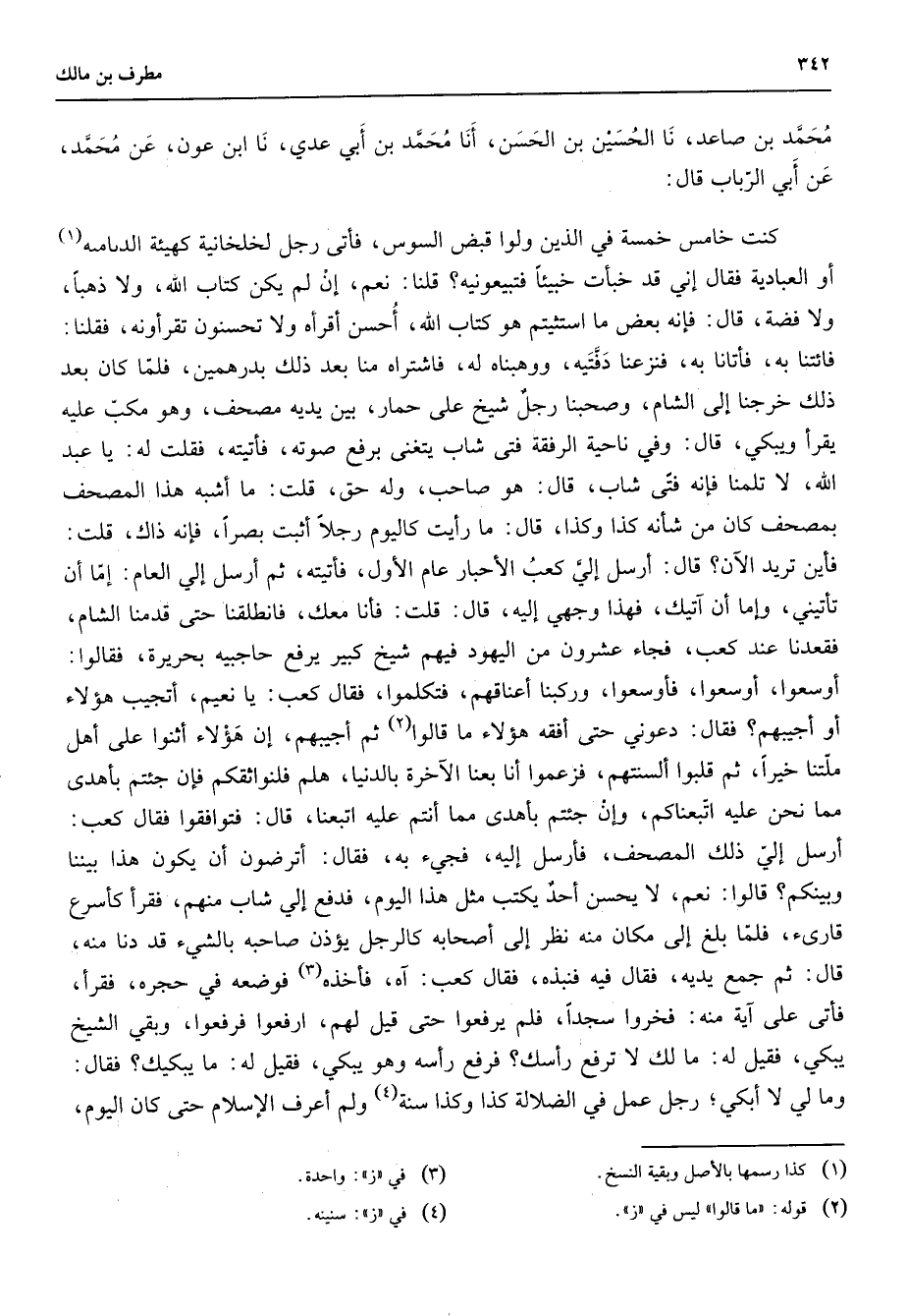 كنت خامس خمسة في الذين ولوا قبض السوس فأتى رجل لخلخانية كهيئة الديامنة (1) أو العبادية فقال إني قد خبأت خبيئا فتبيعونيه قلنا نعم إن لم يكن كتاب الله ولا ذهبا ولا فضة قال فإنه بعض ما استثيتم هو كتاب الله أحسن أقرأه ولا تحسنون تقرأونه فقلنا فائتنا به فأتانا به فنزعنا دفتيه ووهبناه له فاشتراه منا بعد ذلك بدرهمين فلما كان بعد ذلك خرجنا إلى الشام وصحبنا رجل شيخ على حمار بين يديه مصحف وهو مكب عليه يقرأ ويبكي قال وفي ناحية الرفقة فتى شاب يتغنى برفع صوته فأتيته فقلت له يا عبد الله لا تلمنا فإنه فتى شاب قال هو صاحب وله حق قلت ما أشبه هذا المصحف بمصحف كان من شأنه كذا وكذا قال ما رأيت كاليوم رجلا أثبت بصرا فإنه ذاك قلت فأين تريد الآن قال أرسل إلي كعب الأحبار عام الأول فأتيته ثم أرسل إلي العام إما أن تأتيني وإما أن آتيك فهذا وجهي إليه قال قلت فأنا معك فانطلقنا حتى قدمنا الشام فقعدنا عند كعب فجاء عشرون من اليهود فيهم شيخ كبير يرفع حاجبيه بحريرة فقالوا أوسعوا أوسعوا فأوسعوا وركبنا أعناقهم فتكلموا فقال كعب يا نعيم أتجيب هؤلاء أو أجيبهم فقال دعوني حتى أفقه هؤلاء ما قالوا (2) ثم أجيبهم إن هؤلاء أثنوا على أهل ملتنا خيرا ثم قلبوا ألسنتهم فزعموا أنا بعنا الآخرة بالدنيا هلم فلنواثقكم فإن جئتم بأهدى مما نحن عليه اتبعناكم وإن جئتم بأهدى مما أنتم عليه اتبعنا قال فتوافقوا فقال كعب أرسل إلي ذلك المصحف فأرسل إليه فجئ به فقال أترضون أن يكون هذا بيننا وبينكم قالوا نعم لا يحسن أحد يكتب مثل هذا اليوم فدفع إلي شاب منهم فقرأ كأسرع قارئ فلما بلغ إلى مكان منه نظر إلى أصحابه كالرجل يؤذن صاحبه بالشئ قد دنا منه قال ثم جمع يديه فقال فيه فنبذه فقال كعب آه فأخذه (3) فوضعه في حجره فقرأ فأتى على آية منه فخروا سجدا فلم يرفعوا حتى قيل لهم ارفعوا فرفعوا وبقي الشيخ يبكي فقيل له ما لك لا ترفع رأسك فرفع رأسه وهو يبكي فقيل له ما يبكيك فقال وما لي لا أبكي رجل عمل في الضلالة كذا وكذا سنة (4) ولم أعرف الإسلام حتى كان اليوم