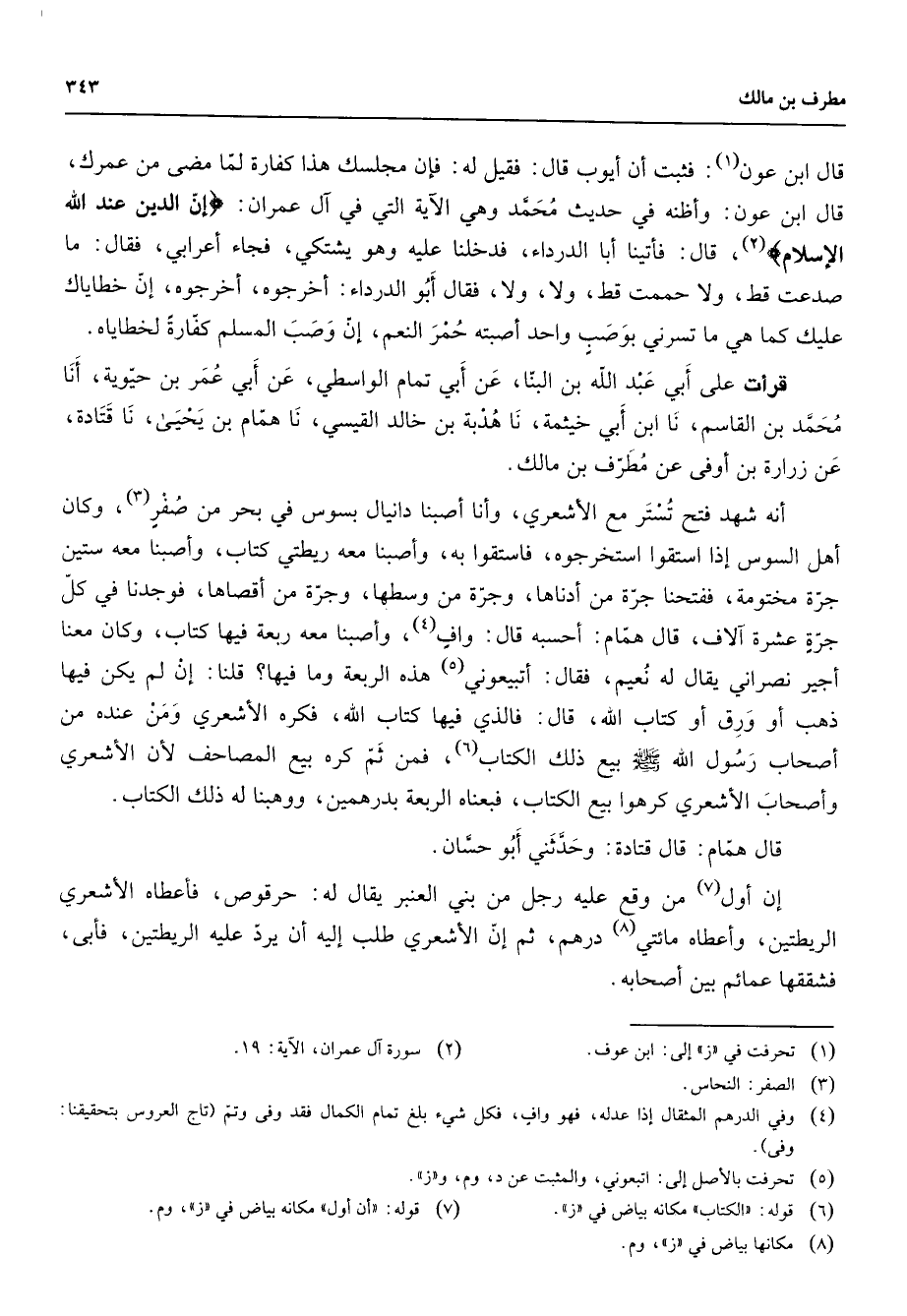 قال ابن عون (1) فثبت أن أيوب قال فقيل له فإن مجلسك هذا كفارة لما مضى من عمرك قال ابن عون وأظنه في حديث محمد وهي الآية التي في آل عمران " إن الدين عند الله الإسلام " (2) قال فأتينا أبا الدرداء فدخلنا عليه وهو يشتكي فجاء أعرابي فقال ما صدعت قط ولا حممت قط ولا ولا فقال أبو الدرداء أخرجوه أخرجوه إن خطاياك عليك كما هي ما تسرني بوصب واحد أصبته حمر النعم إن وصب المسلم كفارة لخطاياه قرأت على أبي عبد الله بن البنا عن أبي تمام الواسطي عن أبي عمر بن حيوية أنا محمد بن القاسم نا ابن أبي خيثمة نا هدبة بن خالد القيسي نا همام بن يحيى نا قتادة عن زرارة بن أوفى عن مطرف بن مالك أنه شهد فتح تستر مع الأشعري وأنا أصبنا دانيال بسوس في بحر من صفر (3) وكان أهل السوس إذا استقوا استخرجوه فاستقوا به وأصبنا معه ريطتي كتاب وأصبنا معه ستين جرة مختومة ففتحنا جرة من أدناها وجرة من وسطها وجرة من أقصاها فوجدنا في كل جرة عشرة آلاف قال همام أحسبه قال واف (4) وأصبنا معه ربعه فيها كتاب وكان معنا أجير نصراني يقال له نعيم فقال أتبيعوني (5) هذه الربعة وما فيها قلنا إن لم يكن فيها ذهب أو ورق أو كتاب الله قال فالذي فيها كتاب الله فكره الأشعري ومن عنده من أصحاب رسول الله (صلى الله عليه وسلم) بيع ذلك الكتاب (6) فمن ثم كره بيع المصاحف لأن الأشعري وأصحاب الأشعري كرهوا بيع الكتاب فبعناه الربعة بدرهمين ووهبنا له ذلك الكتاب قال همام قال قتادة وحدثني أبو حسان إن أول (7) من وقع عليه رجل من بني العنبر يقال له حرقوص فأعطاه الأشعري الريطتين وأعطاه مائتي (8) درهم ثم إن الأشعري طلب إليه أن يرد عليه الريطتين فأبى فشققها عمائم بين أصحابه