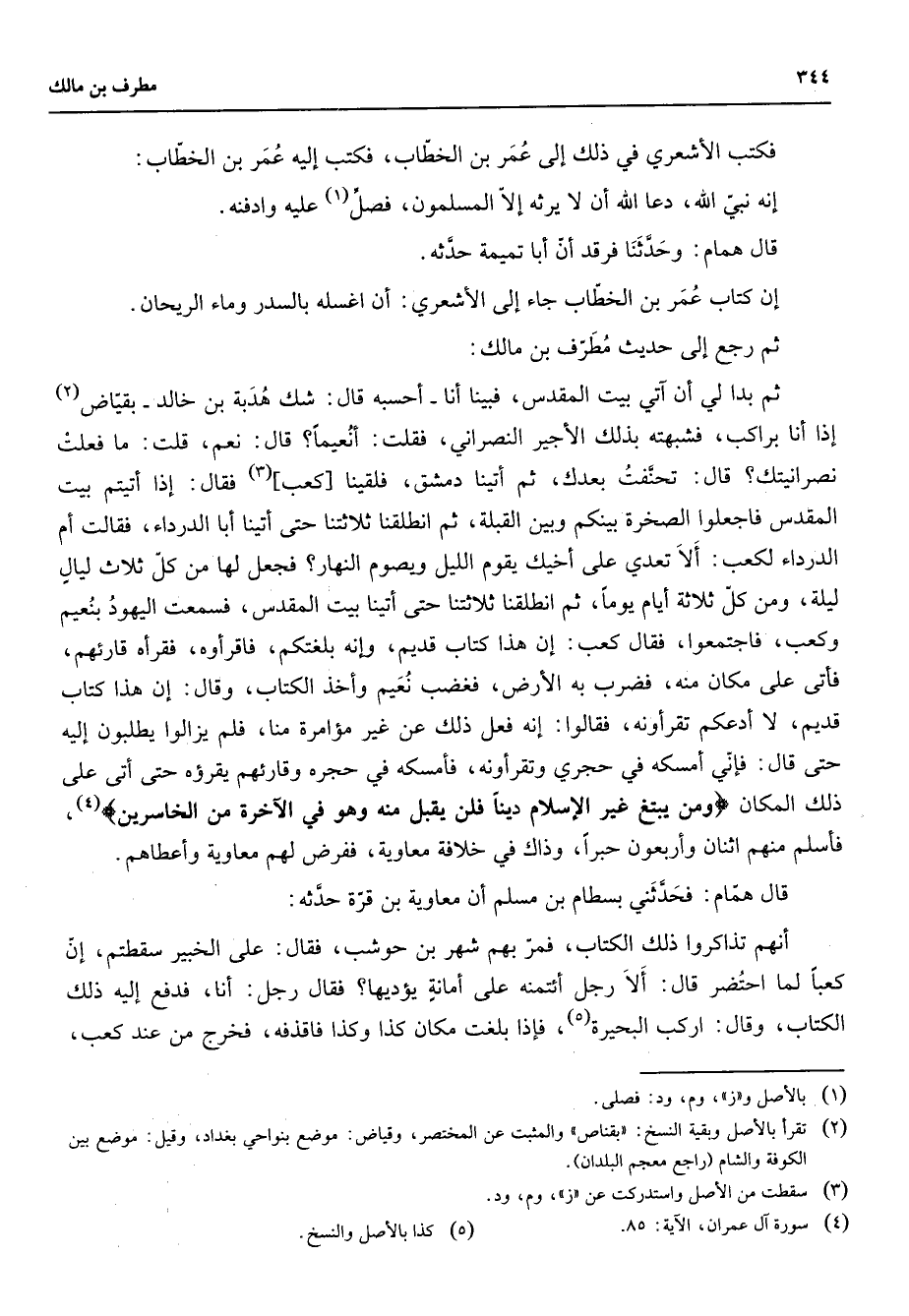 فكتب الأشعري في ذلك إلى عمر بن الخطاب فكتب إليه عمر بن الخطاب إنه نبي الله دعا الله أن لا يرثه إلا المسلمون فصل (1) عليه وادفنه قال همام وحدثنا فرقد أن أبا تميمة حدثه إن كتاب عمر بن الخطاء جاء إلى الأشعري أن اغسله بالسدر وماء الريحان ثم رجع إلى حديث مطرف بن مالك ثم بدا لي أن آتي بيت المقدس فبينا أنا أحسبه قال شك هدبة بن خالد بقياض (2) إذا أنا براكب فشبهته بذلك الأجير النصراني فقلت أنعيما قال نعم قلت ما فعلت نصرانيتك قال تحنفت بعدك ثم أتينا دمشق فلقينا كعب (3) فقال إذا أتيتم بيت المقدس فاجعلوا الصخرة بينكم وبين القبلة ثم انطلقنا ثلاثتنا حتى أتينا أبا الدرداء فقالت أم الدرداء لكعب ألا تعدي على أخيك يقوم الليل ويصوم النهار فجعل لها من كل ثلاث ليال ليلة ومن كل ثلاثة أيام يوما ثم انطلقنا ثلاثتنا حتى أتينا بيت المقدس فسمعت اليهود بنعيم وكعب فاجتمعوا فقال كعب إن هذا كتاب قديم وإنه بلغتكم فاقرأوه فقرأه قارئهم فأتى على مكان منه فضرب به الأرض فغضب نعيم وأخذ الكتاب وقال إن هذا كتاب قديم لا أدعكم تقرأونه فقالوا إنه فعل ذلك عن غير مؤامرة منا فلم يزالوا يطلبون إليه حتى قال فإني أمسكه في حجري وتقرأونه فأمسكه في حجره وقارئهم يقرؤه حتى أتى على ذلك المكان " ومن يبتغ غير الإسلام دينا فلن يقبل منه وهو في الآخرة من الخاسرين " (4) فأسلم منهم اثنان وأربعون حبرا وذاك في خلافة معاوية ففرض لهم معاوية وأعطاهم قال همام فحدثني بسطام بن مسلم أن معاوية بن قرة حدثه أنهم تذاكروا ذلك الكتاب فمر بهم شهر بن حوشب فقال على الخبير سقطتم إن كعبا لما احتضر قال ألا رجل أئتمنه على أمانة يؤديها فقال رجل أنا فدفع إليه ذلك الكتاب وقال اركب البحيرة (5) فإذا بلغت مكان كذا وكذا فاقذفه فخرج من عند كعب