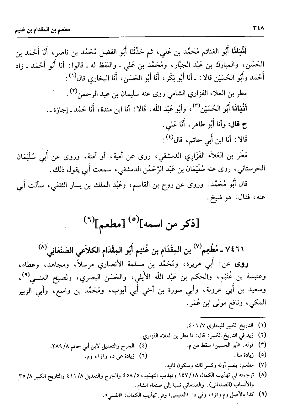 7461 - مطعم (7) بن المقدام بن غنيم أبو المقدام الكلاعي الصنعاني (8) روى عن أبي هريرة ومحمد بن مسلمة الأنصاري مرسلا ومجاهد وعطاء وعنبسة بن غنيم والحكم بن عبد الله الأيلي والحسن البصري ونصيح العنسي (9) وسعيد بن أبي عروبة وأبي سورة بن أخي أبي أيوب ومحمد بن واسع وأبي الزبير المكي ونافع مولى ابن عمر