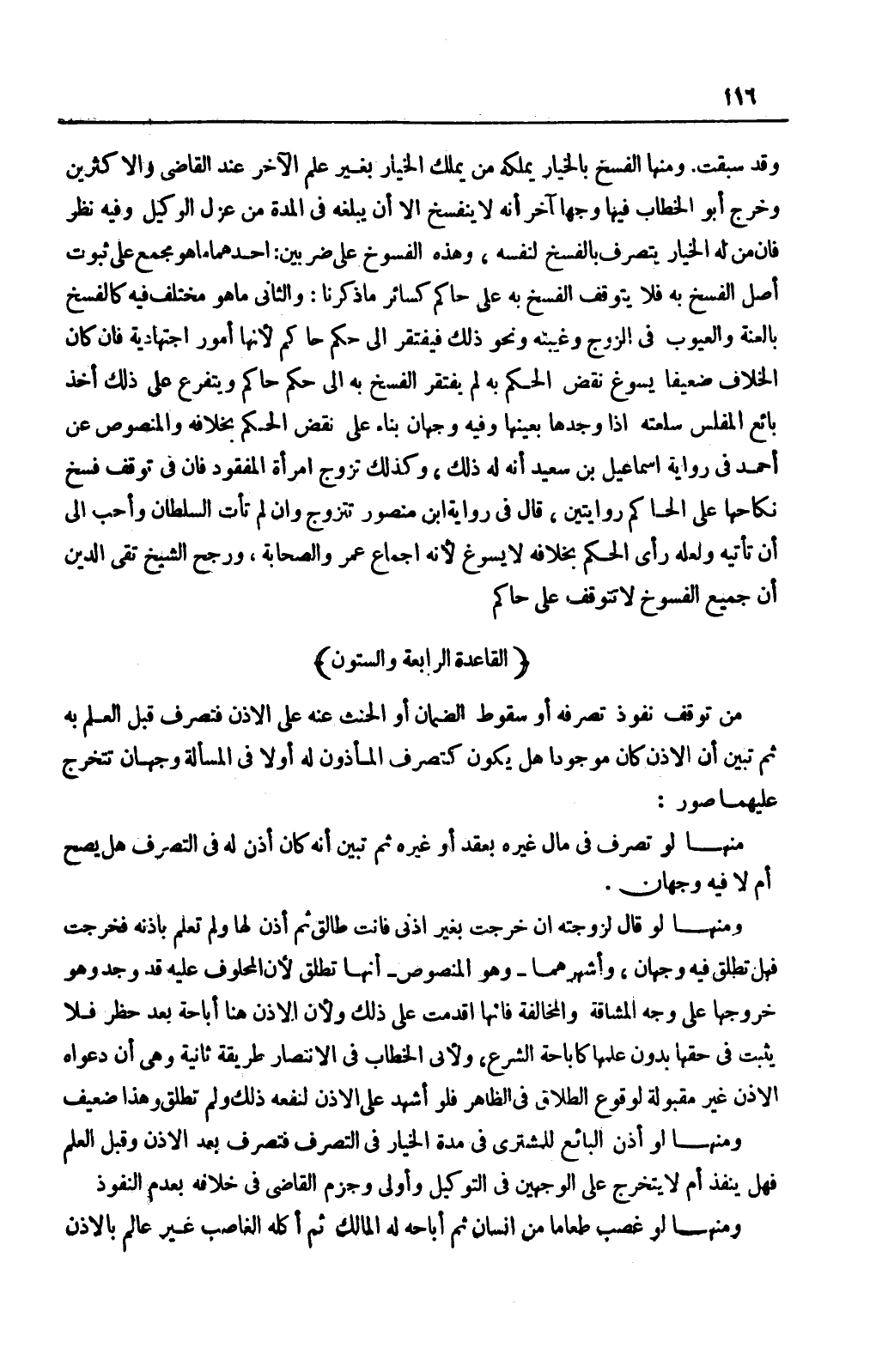 وَالثَّانِي: مَا هُوَ مُخْتَلَفٌ فِيهِ كَالْفَسْخِ بِالْعُنَّةِ وَالْعُيُوبِ فِي الزَّوْجِ وَغَيْبَتِهِ وَنَحْوِ ذَلِكَ فَيَفْتَقِرُ إلَى حُكْمِ حَاكِمٍ لِأَنَّهَا أُمُورٌ اجْتِهَادِيَّةٌ فَإِنْ كَانَ الْخِلَافُ ضَعِيفًا يَسُوغُ نَقْضُ الْحُكْمِ بِهِ لَمْ يَفْتَقِرْ الْفَسْخُ بِهِ إلَى حُكْمِ حَاكِمٍ وَيَتَفَرَّعُ عَلَى ذَلِكَ أَخْذُ بَائِعِ الْمُفْلِسِ سِلْعَتَهُ إذَا وَجَدَهَا بِعَيْنِهَا وَفِيهِ وَجْهَانِ بِنَاءً عَلَى نَقْضِ الْحُكْمِ بِخِلَافِهِ وَالْمَنْصُوصُ عَنْ أَحْمَدَ فِي رِوَايَةِ إسْمَاعِيلَ بْنِ سَعِيدٍ أَنَّهُ لَهُ ذَلِكَ، وَكَذَلِكَ تَزَوُّجُ امْرَأَةِ الْمَفْقُودِ فَإِنَّ فِي تَوَقُّفِ فَسْخِ نِكَاحِهَا عَلَى الْحَاكِمِ رِوَايَتَيْنِ، قَالَ فِي رِوَايَةِ ابْنِ مَنْصُورٍ تَتَزَوَّجُ وَإِنْ لَمْ تَأْتِ السُّلْطَانَ وَأَحَبُّ إلَيَّ أَنْ تَأْتِيَهُ وَلَعَلَّهُ رَأَى الْحُكْمَ بِخِلَافِهِ لَا يَسُوغُ لِأَنَّهُ إجْمَاعُ عُمَرَ وَالصَّحَابَةِ، وَرَجَّحَ الشَّيْخُ تَقِيُّ الدِّينِ أَنَّ جَمِيعَ الْفُسُوخِ لَا تَتَوَقَّفُ عَلَى حَاكِمٍ.