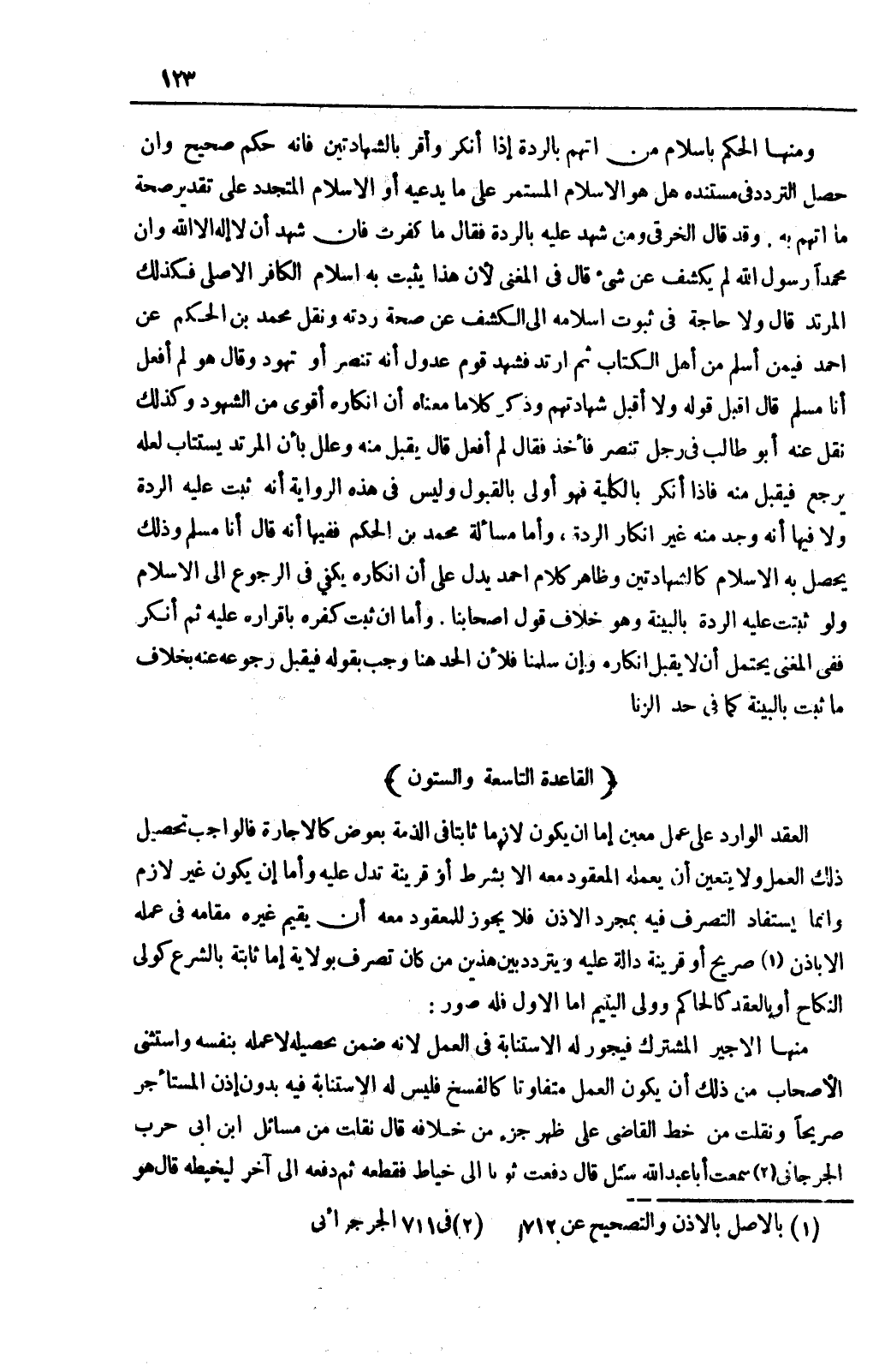 وَمِنْهَا الْحُكْمُ بِإِسْلَامِ مَنْ اُتُّهِمَ بِالرِّدَّةِ إذَا أَنْكَرَ وَأَقَرَّ بِالشَّهَادَتَيْنِ فَإِنَّهُ حُكْمٌ صَحِيحٌ وَإِنْ حَصَلَ التَّرَدُّدُ فِي مُسْتَنَدِهِ هَلْ هُوَ الْإِسْلَامُ الْمُسْتَمِرُّ عَلَى مَا يَدَّعِيه أَوْ الْإِسْلَامُ الْمُتَجَدِّدُ عَلَى تَقْدِيرِ صِحَّةِ مَا اُتُّهِمَ بِهِ؟ وَقَدْ قَالَ الْخِرَقِيِّ وَمَنْ تَشْهَدْ عَلَيْهِ بِالرِّدَّةِ؟ فَقَالَ مَا كَفَرْتُ فَإِنْ شَهِدَ أَنْ لَا إلَهَ إلَّا اللَّهُ وَأَنَّ مُحَمَّدًا رَسُولُ اللَّهِ لَمْ يَكْشِفْ عَنْ شَيْءٍ.