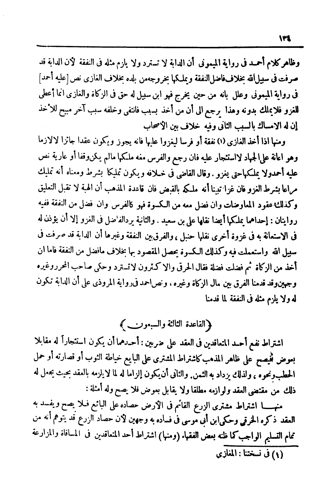 وَالثَّانِيَة: يَرُدُّ الْفَاضِلَ فِي الْغَزْوِ إلَّا أَنْ يُؤْذَنَ لَهُ فِي الِاسْتِعَانَةِ بِهِ فِي غَزْوَةٍ أُخْرَى نَقَلَهَا حَنْبَلٌ، وَالْفَرْقُ بَيْنَ النَّفَقَةِ وَغَيْرِهَا أَنَّ الدَّابَّةَ قَدْ صُرِفَتْ فِي سَبِيلِ اللَّهِ وَاسْتُعْمِلَتْ فِيهِ وَكَذَلِكَ الْكِسْوَةُ يَحْصُلُ الْمَقْصُودُ بِهَا بِخِلَافِ مَا فَضَلَ مِنْ النَّفَقَةِ فَأَمَّا إنْ أَخَذَ مِنْ الزَّكَاةِ ثُمَّ فَضَلَتْ فَضْلَةٌ فَقَالَ الْخِرَقِيِّ وَالْأَكْثَرُونَ لَا تُسْتَرَدُّ وَحَكَى صَاحِبُ الْمُحَرَّرِ وَغَيْرُهُ وَجْهَيْنِ وَقَدْ قَدَّمْنَا الْفَرْقَ بَيْنَ مَالِ الزَّكَاةِ وَغَيْرِهِ، وَنَصَّ أَحْمَدُ فِي رِوَايَةِ الْمَرُّوذِيّ عَلَى أَنَّ الدَّابَّةَ تَكُونُ لَهُ وَلَا يَلْزَمُ مِثْلُهُ فِي النَّفَقَةِ لِمَا قَدَّمْنَا.
