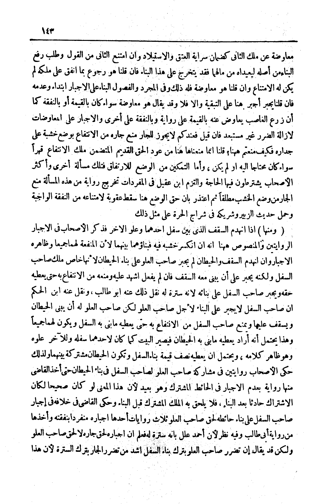 مُعَاوَضَةٌ عَنْ مِلْكِ الثَّانِي كَضَمَانِ سِرَايَةِ الْعِتْقِ وَالِاسْتِيلَادِ، وَإِنْ امْتَنَعَ الثَّانِي مِنْ الْقَوْلِ وَطَلَبَ رَفْعَ الْبِنَاءِ مِنْ أَصْلِهِ لِيُعِيدَاهُ مِنْ مَالِهِمَا فَقَدْ يَتَخَرَّجُ عَلَى هَذَا الْبِنَاءِ فَإِنْ قُلْنَا هُوَ رُجُوعٌ بِمَا أَنْفَقَ عَلَى مِلْكِهِ لَمْ يَكُنْ لَهُ الِامْتِنَاعُ وَإِنْ قُلْنَا هُوَ مُعَاوَضَةٌ فَلَهُ ذَلِكَ وَفِي الْمُجَرَّدِ وَالْفُصُولِ الْبِنَاءُ عَلَى الْإِجْبَارِ ابْتِدَاءً وَعَدَمُهُ فَإِنْ قُلْنَا يُجْبَرُ أُجْبِرَ هُنَا عَلَى التَّبْقِيَةِ وَإِلَّا فَلَا وَقَدْ يُقَالُ هُوَ مُعَاوَضَةٌ سَوَاءٌ كَانَ بِالْقِيمَةِ أَوْ بِالنَّفَقَةِ كَمَا أَنَّ زَرْعَ الْغَاصِبِ يُعَاوَضُ عَنْهُ بِالْقِيمَةِ عَلَى رِوَايَةٍ وَبِالنَّفَقَةِ عَلَى أُخْرَى وَالْإِجْبَارُ عَلَى الْمُعَاوَضَاتِ لِإِزَالَةِ الضَّرَرِ غَيْرُ مُسْتَبْعَدٍ فَإِنْ قِيلَ فَعِنْدَكُمْ لَا يَجُوزُ لِلْجَارِ مَنْعُ جَارِهِ مِنْ الِانْتِفَاعِ بِوَضْعِ خَشَبَةٍ عَلَى جِدَارِهِ فَكَيْفَ مَنَعْتُمْ هَهُنَا؟ قُلْنَا إنَّمَا مَنَعْنَاهَا هُنَا مِنْ عَوْدِ الْحَقِّ الْقَدِيمِ الْمُتَضَمِّنِ مِلْكَ الِانْتِفَاعِ قَهْرًا سَوَاءٌ كَانَ مُحْتَاجًا إلَيْهِ أَوْ لَمْ يَكُنْ، وَأَمَّا التَّمْكِينُ مِنْ الْوَضْعِ لِلِارْتِفَاقِ فَتِلْكَ مَسْأَلَةٌ أُخْرَى وَأَكْثَرُ الْأَصْحَابِ يَشْتَرِطُونَ فِيهَا الْحَاجَةَ وَالْتَزَمَ ابْنُ عَقِيلٍ فِي الْمُفْرَدَاتِ تَخْرِيجَ رِوَايَةٍ مِنْ هَذِهِ الْمَسْأَلَةِ مَنَعَ الْجَارَ مِنْ وَضْعِ الْخَشَبِ مُطْلَقًا ثُمَّ اعْتَذَرَ بِأَنَّ حَقَّ الْوَضْعِ هُنَا سَقَطَ عُقُوبَةً لِامْتِنَاعِهِ مِنْ النَّفَقَةِ الْوَاجِبَةِ وَحَمَلَ حَدِيثَ الزُّبَيْرِ وَشَرِيكِهِ فِي شِرَاجِ الْحُرَّةِ عَلَى مِثْلِ ذَلِكَ.