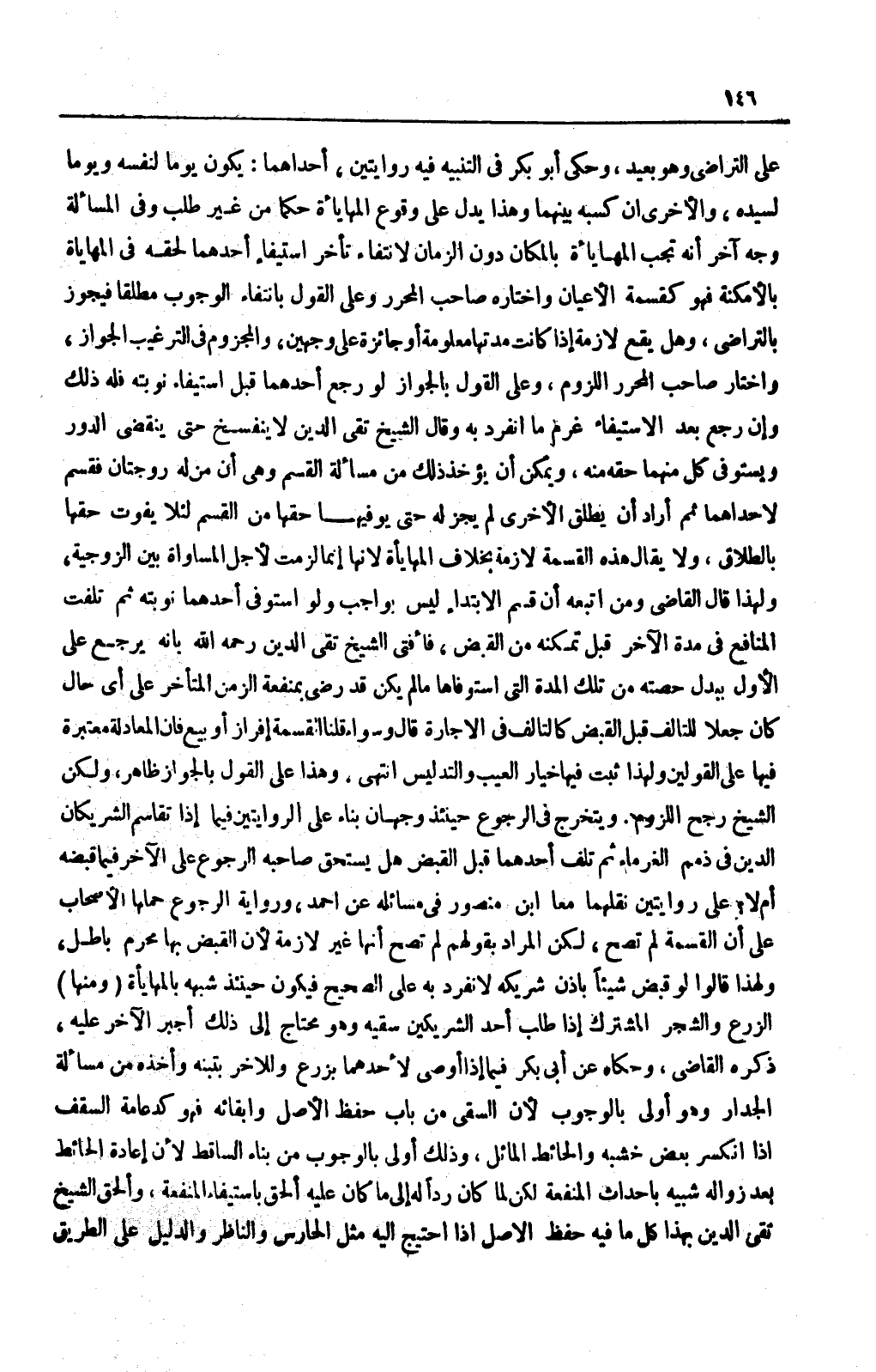 عَلَى التَّرَاضِي وَهُوَ بَعِيدٌ، وَحَكَى أَبُو بَكْرٍ فِي التَّنْبِيهِ فِيهِ رِوَايَتَيْنِ، إحْدَاهُمَا: يَكُونُ يَوْمًا لِنَفْسِهِ وَيَوْمًا لِسَيِّدِهِ، وَالْأُخْرَى أَنَّ كَسْبَهُ بَيْنَهُمَا وَهَذَا يَدُلُّ عَلَى وُقُوعِ الْمُهَايَأَةِ حُكْمًا مِنْ غَيْرِ طَلَبٍ وَفِي الْمَسْأَلَةِ وَجْهٌ آخَرُ أَنَّهُ تَجِبُ الْمُهَايَأَةُ بِالْمَكَانِ دُونَ الزَّمَانِ لِانْتِفَاءِ تَأَخُّرِ اسْتِيفَاءِ أَحَدِهِمَا لِحَقِّهِ فِي الْمُهَايَأَةِ بِالْأَمْكِنَةِ فَهُوَ كَقِسْمَةِ الْأَعْيَانِ وَاخْتَارَهُ صَاحِبُ الْمُحَرَّرِ وَعَلَى الْقَوْلِ بِانْتِفَاءِ الْوُجُوبِ مُطْلَقًا فَيَجُوزُ بِالتَّرَاضِي، وَهَلْ تَقَعُ لَازِمَةً إذَا كَانَتْ مُدَّتُهَا مَعْلُومَةً أَوْ جَائِزَةً؟ عَلَى وَجْهَيْنِ. وَالْمَجْزُومُ فِي التَّرْغِيبِ الْجَوَازُ، وَاخْتَارَ صَاحِبُ الْمُحَرَّرِ اللُّزُومَ، وَعَلَى الْقَوْلِ بِالْجَوَازِ لَوْ رَجَعَ أَحَدُهُمَا قَبْلَ اسْتِيفَاءِ نَوْبَتِهِ فَلَهُ ذَلِكَ وَإِنْ رَجَعَ بَعْدَ الِاسْتِيفَاءِ غَرِمَ مَا انْفَرَدَ بِهِ وَقَالَ الشَّيْخُ تَقِيُّ الدِّينِ لَا يَنْفَسِخُ حَتَّى يَنْقَضِيَ الدَّوْرُ وَيَسْتَوْفِيَ كُلٌّ مِنْهُمَا حَقَّهُ مِنْهُ، وَيُمْكِنُ أَنْ يُؤْخَذَ ذَلِكَ مِنْ مَسْأَلَةِ الْقَسْمِ وَهِيَ أَنَّ مَنْ لَهُ زَوْجَتَانِ فَقَسَمَ لِإِحْدَاهُمَا ثُمَّ أَرَادَ أَنْ يُطَلِّقَ الْأُخْرَى لَمْ يَجُزْ لَهُ حَتَّى يُوَفِّيَهَا حَقّهَا مِنْ الْقَسْمِ لِئَلَّا يَفُوتَ حَقُّهَا بِالطَّلَاقِ، وَلَا يُقَالُ هَذِهِ الْقِسْمَةُ لَازِمَةٌ بِخِلَافِ الْمُهَايَأَةِ لِأَنَّهَا إنَّمَا لَزِمَتْ لِأَجْلِ الْمُسَاوَاةِ بَيْنَ الزَّوْجِيَّةِ، وَلِهَذَا قَالَ الْقَاضِي وَمَنْ اتَّبَعَهُ أَنَّ قَسْمَ الِابْتِدَاءِ لَيْسَ بِوَاجِبٍ وَلَوْ اسْتَوْفَى أَحَدُهُمَا شُرَطَتِهِ ثُمَّ تَلِفَتْ الْمَنَافِعُ فِي الذَّكَرِ الْآخَرِ قَبْلَ تَمَكُّنِهِ مِنْ الْقَبْضِ، فَأَفْتَى الشَّيْخُ تَقِيُّ الدِّينِ رَحِمَهُ اللَّهُ بِأَنَّهُ يَرْجِعُ عَلَى الْأَوَّلِ بِبَدَلِ حِصَّتِهِ مِنْ تِلْكَ الْمُدَّةِ الَّتِي اسْتَوْفَاهَا مَا لَمْ يَكُنْ قَدْ رَضِيَ بِمَنْفَعَةِ الزَّمَنِ الْمُتَأَخِّرِ عَلَى أَيِّ حَالٍ كَانَ جَعْلًا لِلتَّالِفِ قَبْلَ الْقَبْضِ كَالتَّالِفِ فِي الْإِجَارَةِ قَالَ وَسَوَاءٌ قُلْنَا الْقِسْمَةُ إفْرَازٌ أَوْ بَيْعٌ فَإِنَّ الْمُعَادَلَةَ مُعْتَبَرَةٌ فِيهَا عَلَى الْقَوْلَيْنِ وَلِهَذَا ثَبَتَ فِيهَا خِيَارُ الْعَيْبِ وَالتَّدْلِيسِ انْتَهَى.