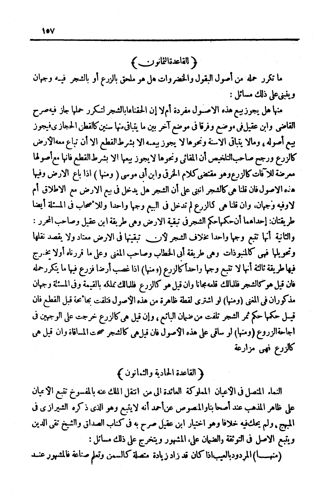 ِ؟ فِيهِ وَجْهَانِ وَيَنْبَنِي عَلَى ذَلِكَ مَسَائِلُ: مِنْهَا هَلْ يَجُوزُ بَيْعُ هَذِهِ الْأُصُولِ مُفْرَدَةً أَمْ لَا إنْ أَلْحَقْنَاهَا بِالشَّجَرِ لِتَكَرُّرِ حَمْلِهَا جَازَ فِيهِ صَرَّحَ الْقَاضِي وَابْنُ عَقِيلٍ فِي مَوْضِعٍ وَفَرَّقَا فِي مَوْضِعٍ آخَرَ بَيْنَ مَا يَتَبَاقَى مِنْهَا سِنِينَ كَالْقُطْنِ الْحِجَازِيِّ فَيَجُوزُ بَيْعُ أُصُولِهِ، وَمَا لَا يَتَبَاقَى إلَّا سَنَةً وَنَحْوَهَا لَا يَجُوزُ بَيْعُهَا إلَّا بِشَرْطِ الْقَطْعِ إلَّا أَنْ تُبَاعَ مَعَهُ الْأَرْضُ كَالزَّرْعِ وَرَجَّحَ صَاحِبُ التَّلْخِيصِ أَنَّ الْمَقَاثِيَ وَنَحْوَهَا لَا يَجُوزُ بَيْعُهَا إلَّا بِشَرْطِ الْقَطْعِ فَإِنَّهَا مَعَ أُصُولِهَا مُعَرَّضَةٌ لِلْآفَاتِ كَالزَّرْعِ وَهُوَ مُقْتَضَى كَلَامِ الْخِرَقِيِّ وَابْنِ أَبِي مُوسَى.