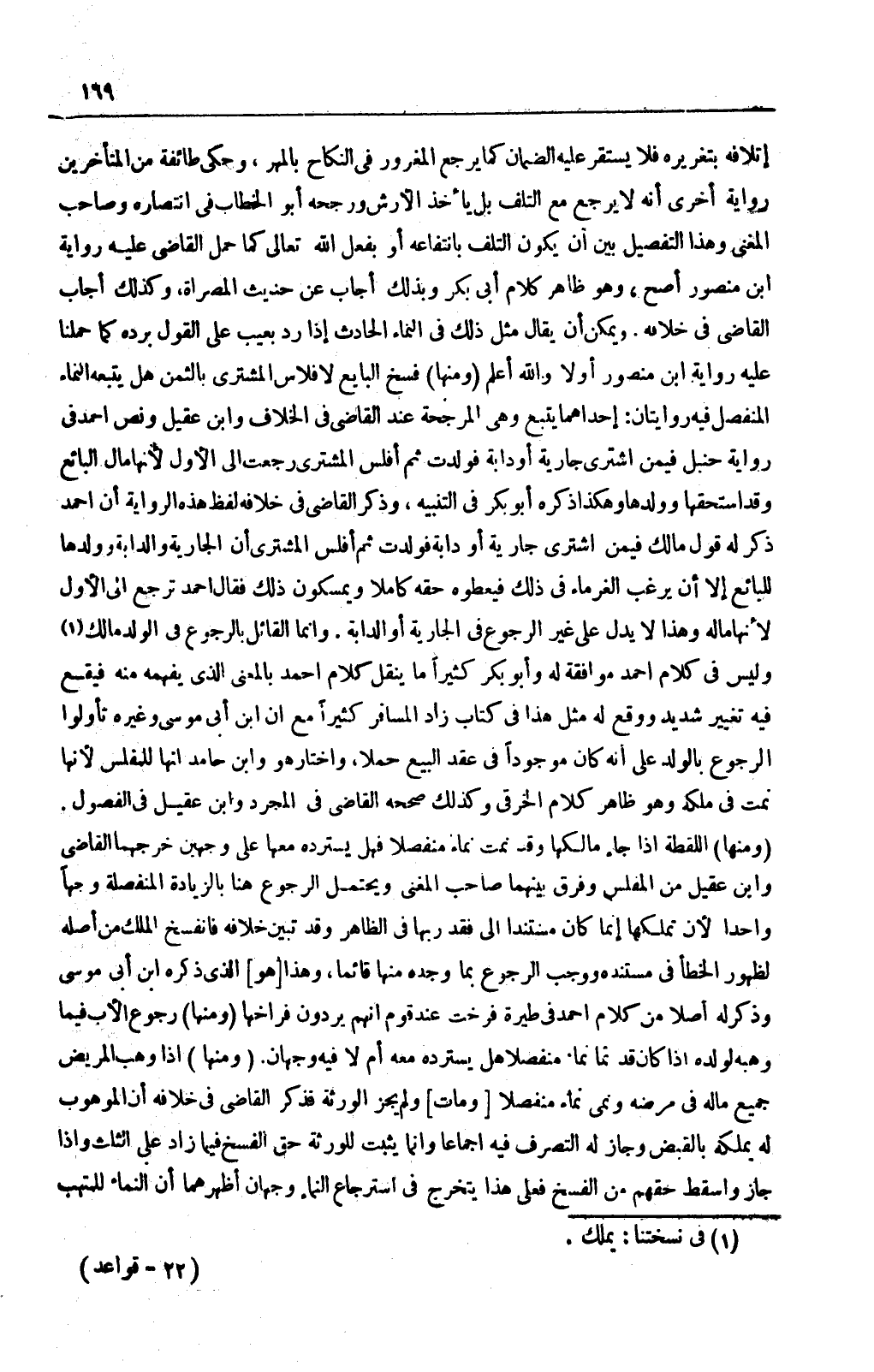 وَإِنَّمَا الْقَائِلُ بِالرُّجُوعِ فِي الْوَلَدِ مَالِكٌ وَلَيْسَ فِي كَلَامِ أَحْمَدَ مُوَافَقَةٌ لَهُ وَأَبُو بَكْرٍ كَثِيرًا مَا يَنْقُلُ كَلَامَ أَحْمَدَ بِالْمَعْنَى الَّذِي يَفْهَمُهُ مِنْهُ فَيَقَعُ فِيهِ تَغْيِيرٌ شَدِيدٌ وَوَقَعَ لَهُ مِثْلُ هَذَا فِي كِتَابِ زَادِ الْمُسَافِرِ كَثِيرًا مَعَ أَنَّ ابْنَ أَبِي مُوسَى وَغَيْرَهُ تَأَوَّلُوا الرُّجُوعَ بِالْوَلَدِ عَلَى أَنَّهُ كَانَ مَوْجُودًا فِي عَقْدِ الْبَيْعِ حَمْلًا، وَاخْتَارَ هُوَ وَابْنُ حَامِدٍ أَنَّهَا لِلْمُفْلِسِ لِأَنَّهَا نَمَتْ فِي مِلْكِهِ وَهُوَ ظَاهِرُ كَلَامِ الْخِرَقِيِّ وَكَذَلِكَ صَحَّحَهُ الْقَاضِي فِي الْمُجَرَّدِ وَابْنُ عَقِيلٍ فِي الْفُصُولِ.