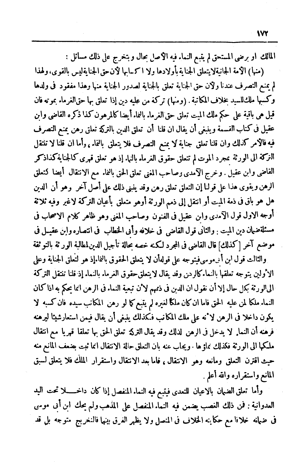 وَخَرَّجَ الْآمِدِيُّ وَصَاحِبُ الْمُغْنِي تَعَلُّقَ الْحَقِّ بِالنَّمَاءِ مَعَ الِانْتِقَالِ أَيْضًا كَتَعَلُّقِ الرَّهْنِ وَيَقْوَى هَذَا عَلَى قَوْلِنَا إنَّ التَّعَلُّقَ تَعَلُّقُ رَهْنٍ وَقَدْ يَنْبَنِي ذَلِكَ عَلَى أَصْلٍ آخَرَ وَهُوَ أَنَّ الدَّيْنَ هَلْ هُوَ بَاقٍ فِي ذِمَّةِ الْمَيِّتِ أَوْ انْتَقَلَ إلَى ذِمَمِ الْوَرَثَةِ أَوْ هُوَ مُتَعَلِّقٌ بِأَعْيَانِ التَّرِكَةِ لَا غَيْرُ، وَفِيهِ ثَلَاثَةُ أَوْجُهٍ الْأَوَّلُ قَوْلُ الْآمِدِيِّ وَابْنِ عَقِيلٍ فِي الْفُنُونِ وَصَاحِبِ الْمُغْنِي وَهُوَ ظَاهِرُ كَلَامِ الْأَصْحَابِ فِي مَسْأَلَةِ ضَمَانِ دَيْنِ الْمَيِّتِ.