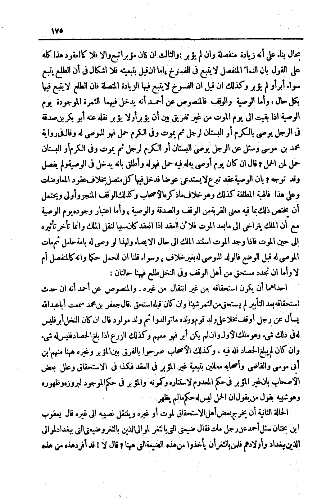 بِحَالٍ بِنَاءً عَلَى أَنَّهُ زِيَادَةٌ مُنْفَصِلَةٌ وَإِنْ لَمْ يُؤَبَّرْ: وَالثَّالِثُ إنْ كَانَ مُؤَبَّرًا تَبِعَ وَإِلَّا فَلَا كَالْعُقُودِ هَذَا كُلُّهُ عَلَى الْقَوْلِ بِأَنَّ النَّمَاءَ الْمُنْفَصِلَ لَا يَتْبَعُ فِي الْفُسُوخِ، أَمَّا إنْ قِيلَ بِتَبَعِيَّتِهِ فَلَا إشْكَالَ فِي أَنَّ الطَّلْعَ يَتْبَعُ سَوَاءٌ أُبِّرَ أَوْ لَمْ يُؤَبَّرْ وَكَذَلِكَ إنْ قِيلَ إنَّ الْفُسُوخَ لَا يَتْبَعُ فِيهَا الزِّيَادَةُ الْمُتَّصِلَةُ فَإِنَّ الطَّلْعَ لَا يَتْبَعُ فِيهَا بِكُلِّ حَالٍ، وَأَمَّا الْوَصِيَّةُ وَالْوَقْفُ فَالْمَنْصُوصُ عَنْ أَحْمَدَ أَنَّهُ يَدْخُلُ فِيهِمَا الثَّمَرَةُ لِاسْتِشْمَامِ يَوْمَ الْوَصِيَّةِ إذَا بَقِيَتْ إلَى يَوْمِ الْمَوْتِ مِنْ غَيْرِ تَفْرِيقٍ بَيْنَ أَنْ يُؤَبَّرَ أَوْ لَا يُؤَبَّرُ نَقَلَهُ عَنْهُ أَبُو بَكْرِ بْنُ صَدَقَةَ فِي الرَّجُلِ يُوصِي بِالْكَرْمِ أَوْ الْبُسْتَانِ لِرَجُلٍ ثُمَّ يَمُوتُ وَفِي الْكَرْمِ حَمْلٌ فَهُوَ لِلْمُوصَى لَهُ وَقَالَ فِي رِوَايَةِ مُحَمَّدِ بْنِ مُوسَى وَسُئِلَ عَنْ الرَّجُلِ يُوصِي الْبُسْتَانَ أَوْ الْكَرْمَ لِرَجُلٍ ثُمَّ يَمُوتُ وَفِي الْكَرْمِ أَوْ الْبُسْتَانِ حَمْلٌ لِمَنْ الْحَمْلُ؟ قَالَ إنْ كَانَ يَوْمَ أَوْصَى بِهِ لَهُ فِيهِ حَمْلٌ فَهُوَ لَهُ وَأَطْلَقَ بِأَنَّهُ يَدْخُلُ فِي الْوَصِيَّةِ وَلَمْ يُفَصِّلْ وَقَدْ تَوَجَّهَ بِأَنَّ الْوَصِيَّةَ عَقْدُ تَبَرُّعٍ لَا يَسْتَدْعِي عِوَضًا فَدَخَلَ فِيهَا كُلُّ مُتَّصِلٍ بِخِلَافِ عُقُودِ الْمُعَاوَضَاتِ وَعَلَى هَذَا فَالْهِبَةُ الْمُطْلَقَةُ كَذَلِكَ وَهُوَ خِلَافُ مَا ذَكَرَهُ الْأَصْحَابُ وَكَذَلِكَ الْوَقْفُ الْمُنَجَّزُ وَأَوْلَى وَيَحْتَمِلُ أَنْ يَخْتَصَّ ذَلِكَ بِمَا فِيهِ مَعْنَى الْقُرْبَةِ مِنْ الْوَقْفِ وَالصَّدَقَةِ وَالْوَصِيَّةِ، وَأَمَّا اعْتِبَارُ وُجُودِهِ يَوْمَ الْوَصِيَّةِ مَعَ أَنَّ الْمِلْكَ يَتَرَاخَى إلَى مَا بَعْدَ الْمَوْتِ فَلِأَنَّ الْعَقْدَ إذَا انْعَقَدَ كَانَ سَبَبًا لِنَقْلِ الْمِلْكِ وَإِنَّمَا تَأَخَّرَ تَأْثِيرُهُ إلَى حِينِ الْمَوْتِ فَإِذَا وُجِدَ الْمَوْتُ اسْتَنَدَ الْمِلْكُ إلَى حَالِ الْإِيصَاءِ وَلِهَذَا لَوْ وَصَّى لَهُ بِأَمَةٍ حَامِلٍ ثُمَّ مَاتَ الْمُوصَى لَهُ قَبْلَ الْوَضْعِ فَالْوَلَدُ لِلْمُوصَى لَهُ بِغَيْرِ خِلَافٍ، وَسَوَاءٌ قُلْنَا إنَّ لِلْحَمْلِ حُكْمًا وَإِنَّهُ كَالْمُنْفَصِلِ أَمْ لَا. وَأَمَّا إنْ تَجَدَّدَ مُسْتَحِقٌّ مِنْ أَهْلِ الْوَقْفِ وَفِي النَّخْلِ طَلْعٌ فَهَهُنَا حَالَتَانِ: إحْدَاهُمَا أَنْ يَكُونَ اسْتِحْقَاقُهُ مِنْ غَيْرِ انْتِقَالٍ مِنْ غَيْرِهِ.