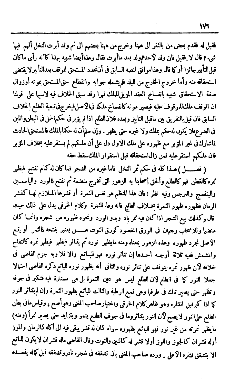 فَقِيلَ لَهُ فَقَدِمَ بَعْضُ مَنْ بِالثَّغْرِ إلَى هُنَا وَخَرَجَ مَنْ هُنَا بَعْضُهُمْ إلَى ثُمَّ وَقَدْ أُبِّرَتْ النَّخْلُ أَلَهُمْ فِيهَا شَيْءٌ؟ قَالَ لَا فَقِيلَ فَإِنْ وُلِدَ لِأَحَدِهِمْ وَلَدٌ بَعْدَ مَا أُبِّرَتْ فَقَالَ وَهَذَا أَيْضًا شَبِيهٌ بِهَذَا كَأَنَّهُ رَأَى مَا كَانَ قَبْلَ التَّأْبِيرِ جَائِزٌ أَوْ كَمَا قَالَ وَهَذَا مُوَافِقٌ لِنَصِّهِ السَّابِقِ فِي أَنَّ تَجَدُّدَ الْمُسْتَحِقِّ لِلْوَقْفِ بَعْدَ التَّأْبِيرِ لَا يَقْتَضِي اسْتِحْقَاقَهُ مِنْهُ وَأَمَّا خُرُوجُ الْخَارِجِ مِنْ الْبَلَدِ فَلَمْ يَشْمَلْهُ جَوَابُهُ وَانْقِطَاعُ حَقّ الْمُسْتَحِقِّ بِمَوْتِهِ أَوْ زَوَالُ صِفَةِ الِاسْتِحْقَاقِ شَبِيهٌ بِانْفِسَاخِ الْعَقْدِ الْمُزِيلِ لِلْمَلِكِ قَهْرًا وَقَدْ سَبَقَ الْخِلَافُ فِيهِ لَا سِيَّمَا عَلَى قَوْلِنَا إنَّ الْوَقْفَ مِلْكٌ لِلْمَوْقُوفِ عَلَيْهِ فَيَصِيرُ مَوْتُهُ كَانْفِسَاخِ مِلْكِهِ فِي الْأَصْلِ فَيَخْرُجُ فِي تَبَعِيَّةِ الطَّلْعِ الْخِلَافُ السَّابِقُ فَإِنْ قِيلَ بِالتَّفْرِيقِ بَيْنَ مَا قَبْلَ التَّأْبِيرِ وَبَعْدَهُ فَلِأَنَّ الطَّلْعَ إذَا لَمْ يُؤَبَّرْ فِي حُكْمِ الْحَمْلِ فِي الْبَطْنِ وَاللَّبَنِ فِي الضَّرْعِ فَلَا يَكُونُ لَهُ حُكْمٌ بِمِلْكٍ وَلَا غَيْرِهِ حَتَّى يَظْهَرَ وَإِنْ سُلِّمَ أَنَّ لَهُ حُكْمًا بِالْمِلْكِ فَالْمُسْتَحِقُّ الْحَادِثُ. لَمَّا شَارَكَ فِي غَيْرِ الْمُؤَبَّرِ مَعَ ظُهُورِهِ عَلَى مِلْكِ الْأَوَّلِ دَلَّ عَلَى أَنَّ مِلْكَهُمْ لَمْ يَسْتَقِرَّ عَلَيْهِ بِخِلَافِ الْمُؤَبَّرِ فَإِنَّ مِلْكَهُمْ اسْتَقَرَّ عَلَيْهِ فَمَنْ زَالَ اسْتِحْقَاقُهُ قَبْلَ اسْتِقْرَارِ الْمِلْكِ سَقَطَ حَقُّهُ.