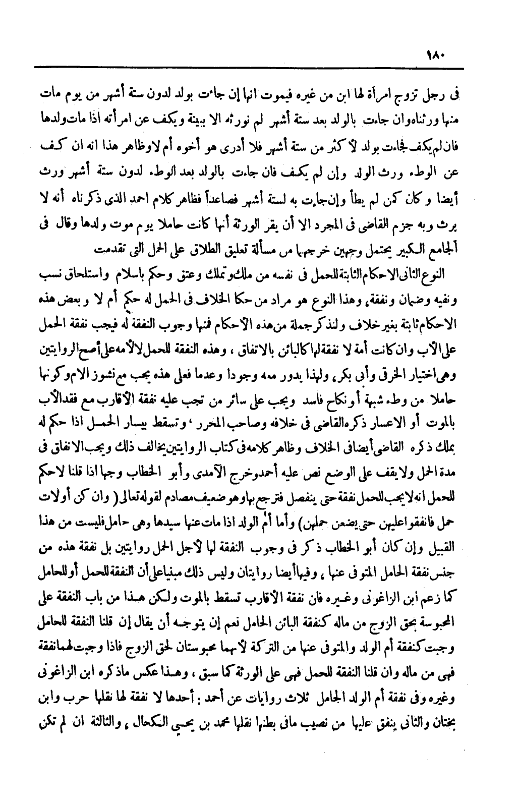 ِ مِنْ مِلْكٍ وَتَمَلُّكٍ وَعِتْقٍ وَحُكْمٍ بِإِسْلَامٍ وَاسْتِلْحَاقِ نَسَبٍ وَنَفْيِهِ وَضَمَانٍ وَنَفَقَةٍ، وَهَذَا النَّوْعُ هُوَ مُرَادُ مَنْ يَأَنَّ الْخِلَافَ فِي الْحَمْلِ لَهُ حُكْمٌ أَمْ لَا وَبَعْضُ هَذِهِ الْأَحْكَامِ ثَابِتَةٌ بِغَيْرِ خِلَافٍ وَلْنَذْكُرْ جُمْلَةً مِنْ هَذِهِ الْأَحْكَامِ فَمِنْهَا وُجُوبُ النَّفَقَةِ لَهُ فَيَجِبُ نَفَقَةُ الْحَمْلِ عَلَى الْأَبِ وَإِنْ كَانَتْ أَمَةً لَا نَفَقَةَ لَهَا كَالْبَائِنِ بِالِاتِّفَاقِ، وَهَذِهِ النَّفَقَةُ لِلْحَمْلِ لَا لِأُمِّهِ عَلَى أَصَحِّ الرِّوَايَتَيْنِ وَهِيَ اخْتِيَارُ الْخِرَقِيِّ وَأَبِي بَكْرٍ، وَلِهَذَا يَدُورُ مَعَهُ وُجُودًا وَعَدَمًا فَعَلَى هَذِهِ يَجِبُ مَعَ نُشُوزِ الْأُمِّ وَكَوْنِهَا حَامِلًا مِنْ وَطْءٍ شُبْهَةً أَوْ نِكَاحٍ فَاسِدٍ وَيَجِبُ عَلَى سَائِرِ مَنْ تَجِبُ عَلَيْهِ نَفَقَةُ الْأَقَارِبِ مَعَ فَقْدِ الْأَبِ بِالْمَوْتِ أَوْ الْإِعْسَارِ ذَكَرَهُ الْقَاضِي فِي خِلَافِهِ وَصَاحِبُ الْمُحَرَّرِ، وَتَسْقُطُ بِيَسَارِ الْحَمْلِ إذَا حُكِمَ لَهُ بِمِلْكٍ، ذَكَرَهُ الْقَاضِي أَيْضًا فِي الْخِلَافِ وَظَاهِرُ كَلَامِهِ فِي كِتَابِ الرِّوَايَتَيْنِ يُخَالِفُ ذَلِكَ وَيَجِبُ الْإِنْفَاقُ فِي مُدَّةِ الْحَمْلِ وَلَا يَقِفُ عَلَى الْوَضْعِ نَصَّ عَلَيْهِ أَحْمَدُ وَخَرَّجَ الْآمِدِيُّ وَأَبُو الْخَطَّابِ وَجْهًا إذَا قُلْنَا: لَا حُكْمَ لِلْحَمْلِ أَنَّهُ لَا يَجِبُ لِلْحَمْلِ نَفَقَةٌ حَتَّى يَنْفَصِلَ فَتَرْجِعُ بِهَا وَهُوَ ضَعِيفٌ مُصَادِمٌ لِقَوْلِهِ تَعَالَى {وَإِنْ كُنَّ أُولَاتِ حَمْلٍ فَأَنْفِقُوا عَلَيْهِنَّ حَتَّى يَضَعْنَ حَمْلَهُنَّ} [الطلاق: ٦] وَأَمَّا أُمُّ الْوَلَدِ إذَا مَاتَ عَنْهَا سَيِّدُهَا وَهِيَ حَامِلٌ فَلَيْسَتْ مِنْ هَذَا الْقَبِيلِ وَإِنْ كَانَ أَبُو الْخَطَّابِ ذَكَرَ فِي وُجُوبِ النَّفَقَةِ لَهَا لِأَجْلِ الْحَمْلِ رِوَايَتَيْنِ بَلْ نَفَقَةُ هَذِهِ مِنْ جِنْسِ نَفَقَةِ الْحَامِلِ الْمُتَوَفَّى عَنْهَا، وَفِيهَا أَيْضًا رِوَايَتَانِ وَلَيْسَ ذَلِكَ مَبْنِيًّا عَلَى أَنَّ النَّفَقَةَ لِلْحَمْلِ أَوْ لِلْحَامِلِ كَمَا زَعَمَ ابْنُ الزاغوني وَغَيْرُهُ فَإِنَّ نَفَقَةَ الْأَقَارِبِ تَسْقُطُ بِالْمَوْتِ وَلَكِنْ هَذَا مِنْ بَابِ النَّفَقَةِ عَلَى الْمَحْبُوسَةِ بِحَقِّ الزَّوْجِ مِنْ مَالِهِ كَنَفَقَةِ الْبَائِنِ الْحَامِلِ نَعَمْ إنْ يَتَوَجَّهْ أَنْ يُقَالَ إنْ قُلْنَا النَّفَقَةُ لِلْحَامِلِ وَجَبَتْ كَنَفَقَةِ أُمِّ الْوَلَدِ وَالْمُتَوَفَّى عَنْهَا مِنْ التَّرِكَةِ ; لِأَنَّهُمَا مَحْبُوسَتَانِ لِحَقِّ الزَّوْجِ فَإِذَا وَجَبَتْ لَهُمَا نَفَقَةٌ فَهِيَ مِنْ مَالِهِ وَإِنْ قُلْنَا النَّفَقَةُ لِلْحَمْلِ فَهِيَ عَلَى الْوَرَثَةِ كَمَا سَبَقَ، وَهَذَا عَكْسُ مَا ذَكَرَهُ ابْنُ الزاغوني وَغَيْرُهُ وَفِي نَفَقَةِ أُمِّ الْوَلَدِ الْحَامِلِ ثَلَاثُ رِوَايَاتٍ عَنْ أَحْمَدَ: أَحَدُهَا لَا نَفَقَةَ لَهَا نَقَلَهَا حَرْبٌ وَابْنُ بُخْتَانَ.