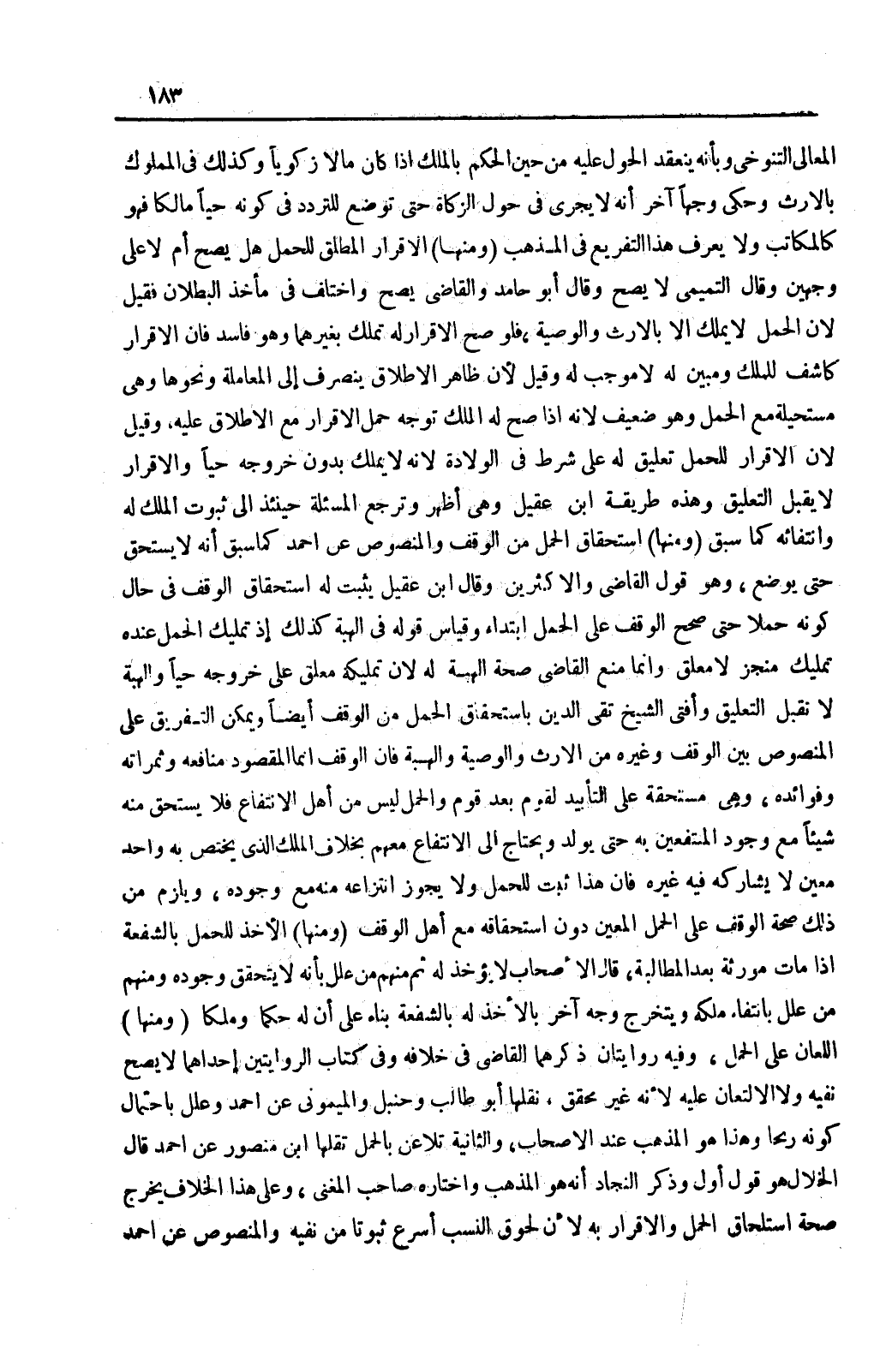 (وَمِنْهَا) اسْتِحْقَاقُ الْحَمْلِ مِنْ الْوَقْفِ وَالْمَنْصُوصُ عَنْ أَحْمَدَ كَمَا سَبَقَ أَنَّهُ لَا يَسْتَحِقُّ حَتَّى يُوضَعَ، وَهُوَ قَوْلُ الْقَاضِي وَالْأَكْثَرِينَ وَقَالَ ابْنُ عَقِيلٍ يَثْبُتُ لَهُ اسْتِحْقَاقُ الْوَقْفِ فِي حَالِ كَوْنِهِ حَمْلًا حَتَّى صَحَّحَ الْوَقْفَ عَلَى الْحَمْلِ ابْتِدَاءً وَقِيَاسُ قَوْلِهِ فِي الْهِبَةِ كَذَلِكَ إذْ تَمْلِيكُ الْحَمْلِ عِنْدَهُ تَمْلِيكٌ مُنْجَزٌ لَا مُعَلَّقٌ وَإِنَّمَا مَنَعَ الْقَاضِي صِحَّةَ الْهِبَةِ لَهُ ; لِأَنَّ تَمْلِيكَهُ مُعَلَّقٌ عَلَى خُرُوجِهِ حَيًّا وَالْهِبَةُ لَا تَقْبَلُ التَّعْلِيقَ وَأَفْتَى الشَّيْخُ تَقِيُّ الدِّينِ بِاسْتِحْقَاقِ الْحَمْلِ مِنْ الْوَقْفِ أَيْضًا وَيُمْكِنُ التَّفْرِيقُ عَلَى الْمَنْصُوصِ بَيْنَ الْوَقْفِ وَغَيْرِهِ مِنْ الْإِرْثِ وَالْوَصِيَّةِ وَالْهِبَةِ فَإِنَّ الْوَقْفَ إنَّمَا الْمَقْصُودُ مَنَافِعُهُ وَثَمَرَاتُهُ وَفَوَائِدُهُ، وَهِيَ مُسْتَحَقَّةٌ عَلَى التَّأْبِيدِ لِقَوْمٍ بَعْدَ قَوْمٍ وَالْحَمْلُ لَيْسَ مِنْ أَهْلِ الِانْتِفَاعِ فَلَا يَسْتَحِقُّ مِنْهُ شَيْئًا مَعَ وُجُودِ الْمُنْتَفِعِينَ بِهِ حَتَّى يُولَدَ وَيَحْتَاجَ إلَى الِانْتِفَاعِ مَعَهُمْ بِخِلَافِ الْمِلْكِ الَّذِي يَخْتَصُّ بِهِ وَاحِدٌ مُعَيَّنٌ لَا يُشَارِكُهُ فِيهِ غَيْرُهُ، فَإِنَّ هَذَا ثَبَتَ لِلْحَمْلِ وَلَا يَجُوزُ انْتِزَاعُهُ مِنْهُ مَعَ وُجُودِهِ، وَيَلْزَمُ مِنْ ذَلِكَ صِحَّةُ الْوَقْفِ عَلَى الْحَمْلِ الْمُعَيَّنِ دُونَ اسْتِحْقَاقِهِ مَعَ أَهْلِ الْوَقْفِ.