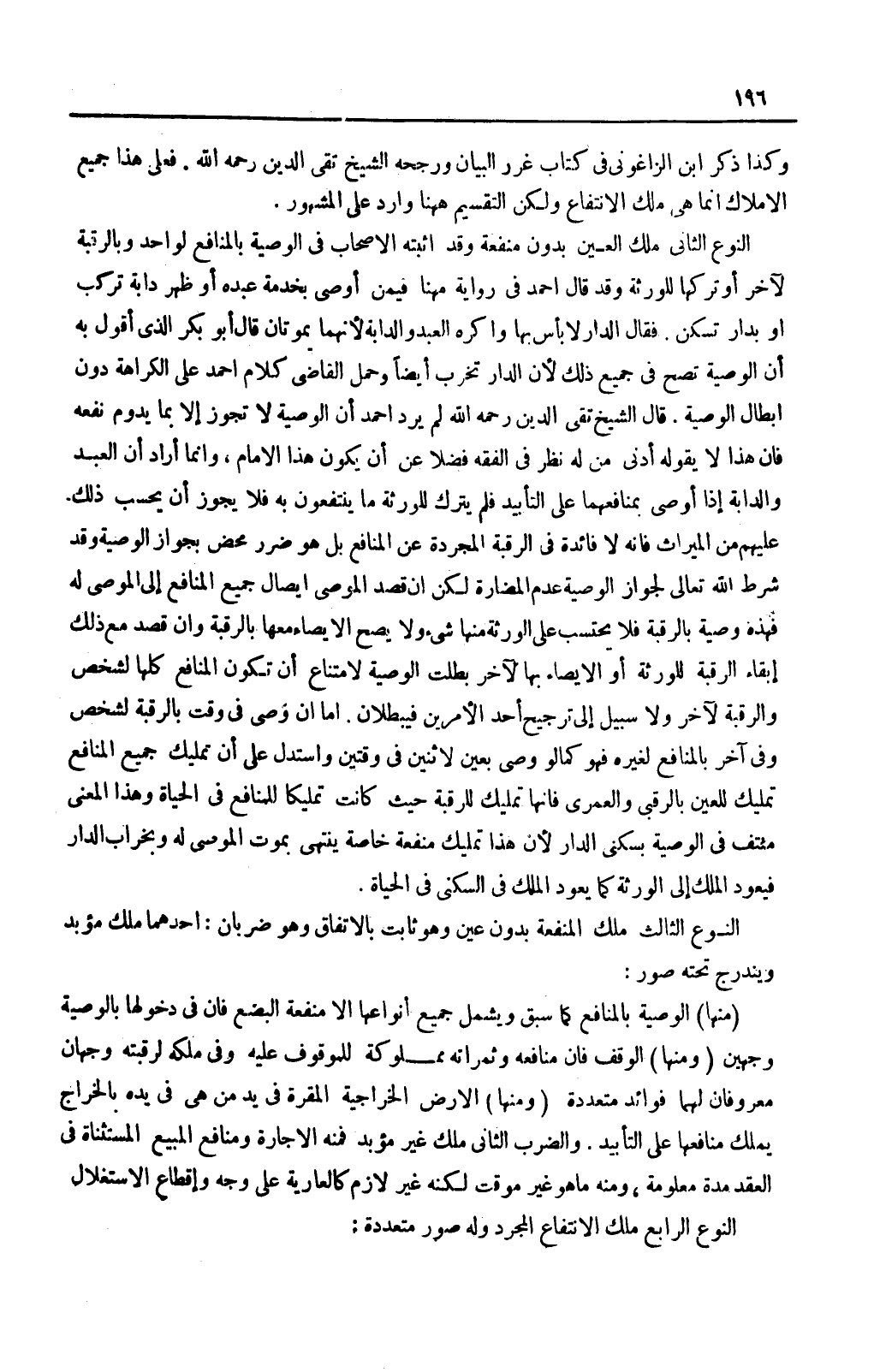 قَالَ الشَّيْخُ تَقِيُّ الدِّينِ رَحِمَهُ اللَّهُ لَمْ يُرِدْ أَحْمَدُ أَنَّ الْوَصِيَّةَ لَا تَجُوزُ إلَّا بِمَا يَدُومُ نَفْعُهُ فَإِنَّ هَذَا لَا يَقُولُهُ أَدْنَى مَنْ لَهُ نَظَرٌ فِي الْفِقْهِ فَضْلًا عَنْ أَنْ يَكُونَ هَذَا الْإِمَامَ، وَإِنَّمَا أَرَادَ أَنَّ الْعَبْدَ وَالدَّابَّةَ إذَا أَوْصَى بِمَنَافِعِهِمَا عَلَى التَّأْبِيدِ فَلَمْ يَتْرُكْ لِلْوَرَثَةِ مَا يَنْتَفِعُونَ بِهِ فَلَا يَجُوزُ أَنْ يُحْسَبَ ذَلِكَ عَلَيْهِمْ مِنْ الْمِيرَاثِ فَإِنَّهُ لَا فَائِدَةَ فِي الرَّقَبَةِ الْمُجَرَّدَةِ عَنْ الْمَنَافِعِ بَلْ هُوَ ضَرَرٌ مَحْضٌ بِجَوَازِ الْوَصِيَّةِ وَقَدْ شَرَطَ اللَّهُ تَعَالَى لِجَوَازِ الْوَصِيَّةِ عَدَمَ الْمُضَارَّةِ لَكِنْ إنْ قَصَدَ الْمُوصِي إيصَالَ جَمِيعِ الْمَنَافِعِ إلَى الْمُوصَى لَهُ فَهَذِهِ وَصِيَّةٌ بِالرَّقَبَةِ فَلَا يُحْتَسَبُ عَلَى الْوَرَثَةِ مِنْهَا شَيْءٌ وَلَا يَصِحُّ الْإِيصَاءُ مَعَهَا بِالرَّقَبَةِ وَإِنْ قَصَدَ مَعَ ذَلِكَ إبْقَاءَ الرَّقَبَةِ لِلْوَرَثَةِ أَوْ الْإِيصَاءَ بِهَا لِآخَرَ بَطَلَتْ الْوَصِيَّةُ لِامْتِنَاعِ أَنْ تَكُونَ الْمَنَافِعُ كُلُّهَا لِشَخْصٍ وَالرَّقَبَةُ لِآخَرَ وَلَا سَبِيلَ إلَى تَرْجِيحِ أَحَدِ الْأَمْرَيْنِ فَيَبْطُلَانِ.
