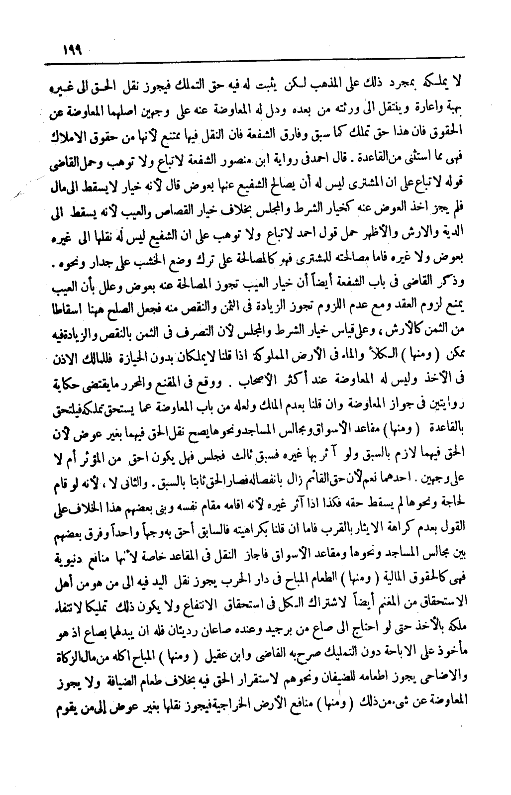 قَالَ أَحْمَدُ فِي رِوَايَةِ ابْنِ مَنْصُورٍ: الشُّفْعَةُ لَا تُبَاعُ وَلَا تُوهَبُ وَحَمَلَ الْقَاضِي قَوْلَهُ لَا تُبَاعُ عَلَى أَنَّ الْمُشْتَرِيَ لَيْسَ لَهُ أَنْ يُصَالِحَ الشَّفِيعَ عَنْهَا بِعِوَضٍ قَالَ ; لِأَنَّهُ خِيَارٌ لَا يَسْقُطُ إلَى مَالٍ فَلَمْ يَجُزْ أَخْذُ الْعِوَضِ عَنْهُ كَخِيَارِ الشَّرْطِ وَالْمَجْلِسِ بِخِلَافِ خِيَارِ الْقِصَاصِ وَالْعَيْبِ ; لِأَنَّهُ يَسْقُطُ إلَى الدِّيَةِ وَالْأَرْشِ وَالْأَظْهَرُ حَمْلُ قَوْلِ أَحْمَدَ لَا تُبَاعُ وَلَا تُوهَبُ عَلَى أَنَّ الشَّفِيعَ لَيْسَ لَهُ نَقْلُهَا إلَى غَيْرِهِ بِعِوَضٍ وَلَا غَيْرِهِ فَأَمَّا مُصَالَحَتُهُ لِلْمُشْتَرِي فَهُوَ كَالْمُصَالَحَةِ عَلَى تَرْكِ وَضْعِ الْخَشَبِ عَلَى جِدَارٍ وَنَحْوِهِ. وَذَكَرَ الْقَاضِي فِي بَابِ الشُّفْعَةِ أَيْضًا أَنَّ خِيَارَ الْعَيْبِ تَجُوزُ الْمُصَالَحَةُ عَنْهُ بِعِوَضٍ وَعَلَّلَ بِأَنَّ الْعَيْبَ يَمْنَعُ لُزُومَ الْعَقْدِ وَمَعَ عَدَمِ اللُّزُومِ تَجُوزُ الزِّيَادَةُ فِي الثَّمَنِ وَالنَّقْصُ مِنْهُ فَجَعَلَ الصُّلْحَ هَهُنَا إسْقَاطًا مِنْ الثَّمَنِ كَالْأَرْشِ، عَلَى قِيَاسِ خِيَارِ الشَّرْطِ وَالْمَجْلِسِ ; لِأَنَّ التَّصَرُّفَ فِي الثَّمَنِ بِالنَّقْصِ وَالزِّيَادَةِ فِيهِ مُمْكِنٌ.