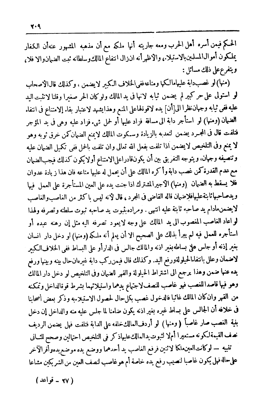 ابْنِ الْحَكَمِ فِيمَنْ أَسَرَهُ أَهْلُ الْحَرْبِ وَمَعَهُ جَارِيَةٌ أَنَّهَا مِلْكُهُ مَعَ أَنَّ مَذْهَبَهُ الْمَشْهُورَ عَنْهُ أَنَّ الْكُفَّارَ يَمْلِكُونَ أَمْوَالَ الْمُسْلِمِينَ بِالِاسْتِيلَاءِ، وَالْأَظْهَرُ أَنَّهُ إنْ زَالَ انْتِفَاعُ الْمَالِكِ وَسُلْطَانُهُ ثَبَتَ الضَّمَانُ وَإِلَّا فَلَا، وَيَتَفَرَّعُ عَلَى ذَلِكَ مَسَائِلُ: