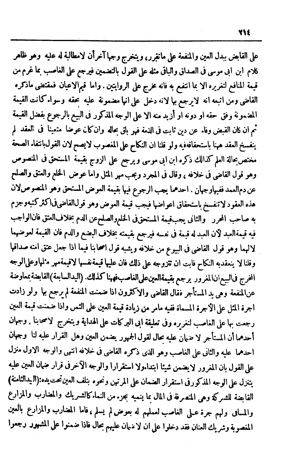 (الْيَدُ الثَّامِنَةُ) الْقَابِضَةُ لِلشَّرِكَةِ وَهِيَ الْمُتَصَرِّفَةُ فِي الْمَالِ بِمَا يُنَمِّيهِ بِجُزْءٍ مِنْ النَّمَاءِ كَالشَّرِيكِ وَالْمُضَارِبِ وَالْمُزَارِعِ وَالْمُسَاقِي وَلَهُمْ جَرَّةٌ عَلَى الْغَاصِبِ لِعَمَلِهِمْ لَهُ بِعِوَضٍ لَمْ يَسْلَمْ، فَأَمَّا الْمُضَارِبُ وَالْمُزَارِعُ بِالْعَيْنِ الْمَغْصُوبَةِ وَشَرِيكُ الْعَنَانِ فَقَدْ دَخَلُوا عَلَى أَنْ لَا ضَمَانَ عَلَيْهِمْ بِحَالٍ فَإِذَا ضَمِنُوا عَلَى الْمَشْهُورِ رَجَعُوا