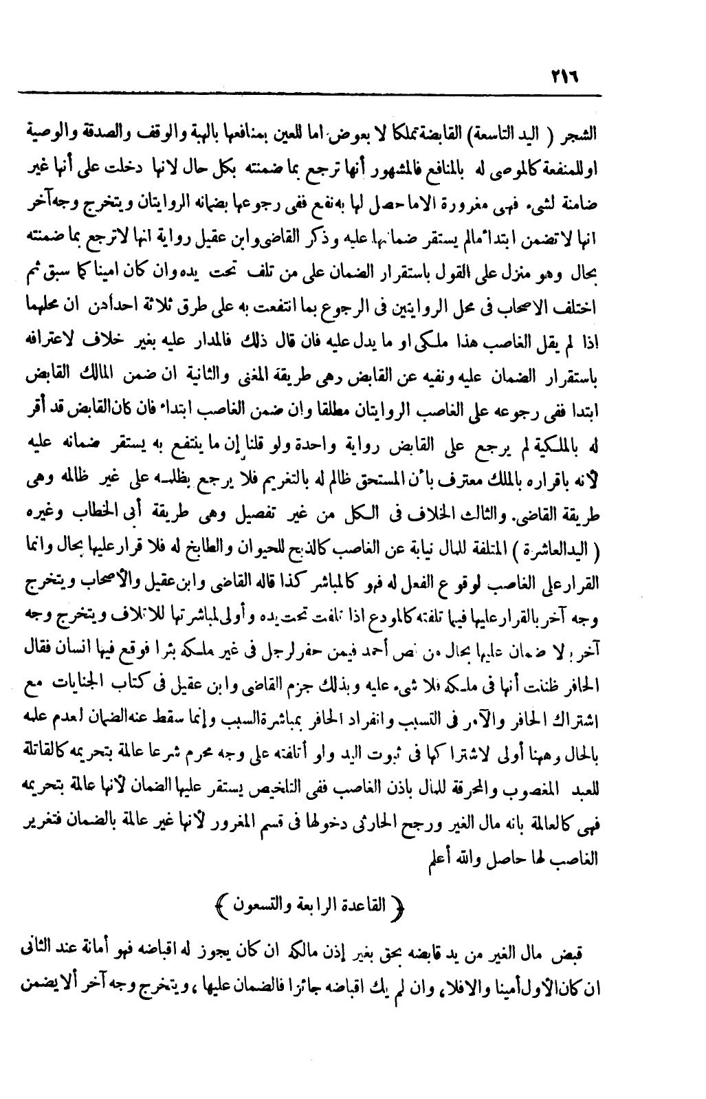 (الْقَاعِدَةُ الرَّابِعَةُ وَالتِّسْعُونَ) : قَبْضُ مَالِ الْغَيْرِ مِنْ يَدِ قَابِضِهِ بِحَقٍّ بِغَيْرِ إذْنِ مَالِكِهِ إنْ كَانَ يَجُوزُ لَهُ إقْبَاضُهُ فَهُوَ أَمَانَةٌ عِنْدَ الثَّانِي إنْ كَانَ الْأَوَّلُ أَمِينًا وَإِلَّا فَلَا، وَإِنْ لَمْ يَكُ إقْبَاضُهُ جَائِزًا فَالضَّمَانُ عَلَيْهِمَا، وَيَتَخَرَّجُ وَجْهٌ آخَرُ أَلَّا يَضْمَنَ