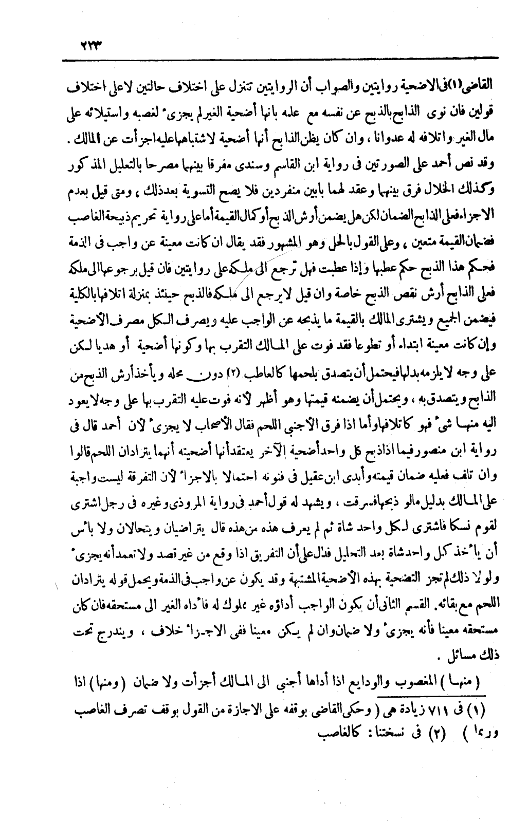 الْقَاضِي فِي الْأُضْحِيَّةِ رِوَايَتَيْنِ وَالصَّوَابُ أَنَّ الرِّوَايَتَيْنِ تَتَنَزَّلُ عَلَى اخْتِلَافِ حَالَتَيْنِ لَا عَلَى اخْتِلَافِ قَوْلَيْنِ فَإِنْ نَوَى الذَّابِحُ بِالذَّبْحِ عَنْ نَفْسِهِ مَعَ عِلْمِهِ بِأَنَّهَا أُضْحِيَّةُ الْغَيْرِ لَمْ يُجْزِئْ لِغَصْبِهِ وَاسْتِيلَائِهِ عَلَى مَالِ الْغَيْرِ وَإِتْلَافِهِ لَهُ عُدْوَانًا، وَإِنْ كَانَ يَظُنُّ الذَّابِحُ أَنَّهَا أُضْحِيَّةٌ لِاشْتِبَاهِهَا عَلَيْهِ أَجْزَأَتْ عَنْ الْمَالِكِ.