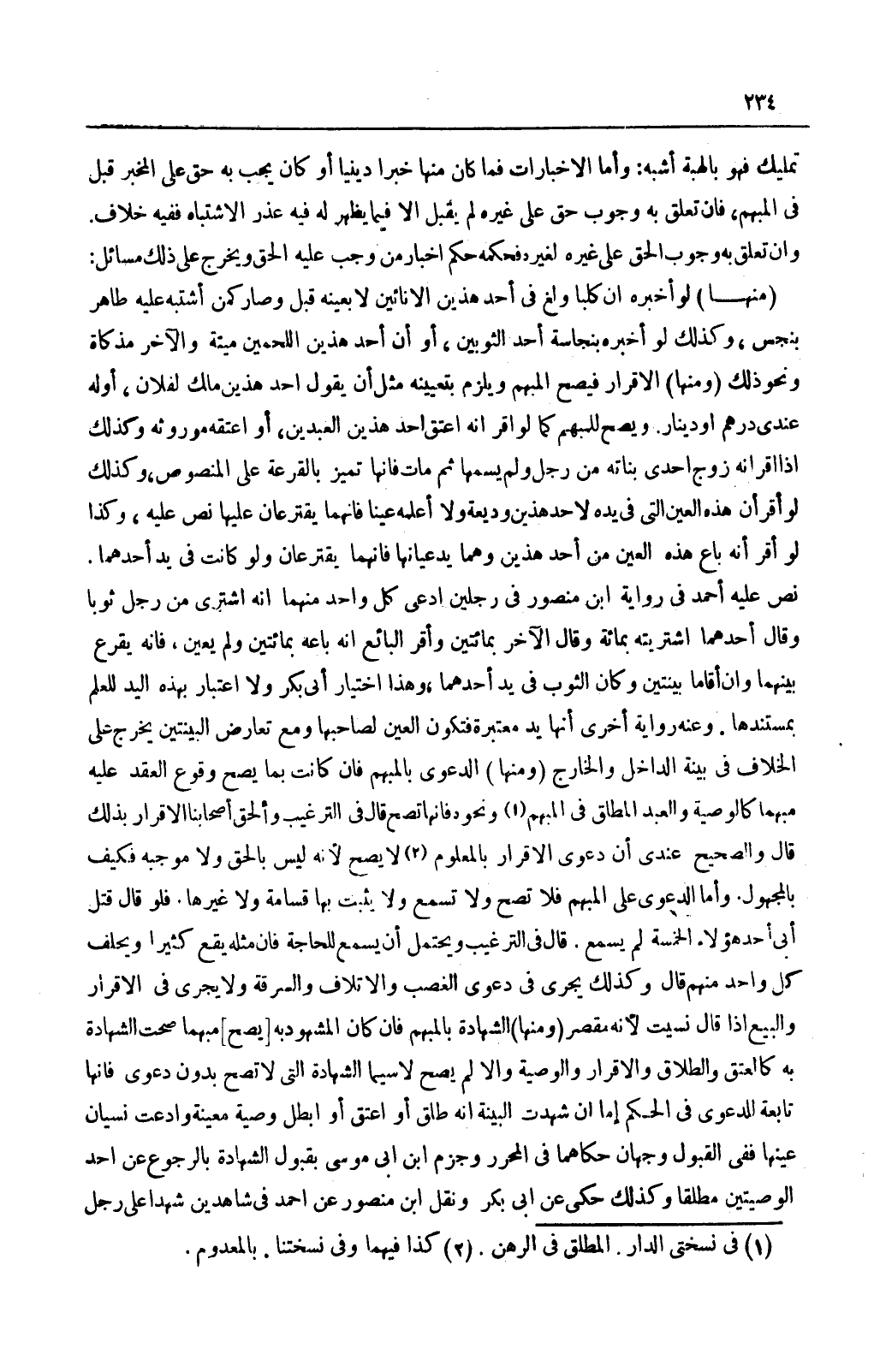 (وَمِنْهَا) الشَّهَادَةُ بِالْمُبْهَمِ فَإِنْ كَانَ الْمَشْهُودُ بِهِ [يَصِحُّ] مُبْهَمًا صَحَّتْ الشَّهَادَةُ بِهِ كَالْعِتْقِ وَالطَّلَاقِ وَالْإِقْرَارِ وَالْوَصِيَّةِ وَإِلَّا لَمْ يَصِحَّ لَا سِيَّمَا الشَّهَادَةُ الَّتِي لَا تَصِحُّ بِدُونِ دَعْوَى فَإِنَّهَا تَابِعَةٌ لِلدَّعْوَى فِي الْحُكْمِ، أَمَّا إنْ شَهِدَتْ الْبَيِّنَةُ أَنَّهُ طَلَّقَ أَوْ أَعْتَقَ أَوْ أَبْطَلَ وَصِيَّةً مُعَيَّنَةً وَادَّعَتْ نِسْيَانَ عَيْنِهَا فَفِي الْقَبُولِ وَجْهَانِ حَكَاهُمَا فِي الْمُحَرَّرِ وَجَزَمَ ابْنُ أَبِي مُوسَى بِقَبُولِ الشَّهَادَةِ بِالرُّجُوعِ عَنْ أَحَدِ الْوَصِيَّتَيْنِ مُطْلَقًا وَكَذَلِكَ حُكِيَ عَنْ أَبِي بَكْرٍ وَنَقَلَ ابْنُ مَنْصُورٍ عَنْ أَحْمَدَ فِي شَاهِدَيْنِ شَهِدَا عَلَى رَجُلٍ