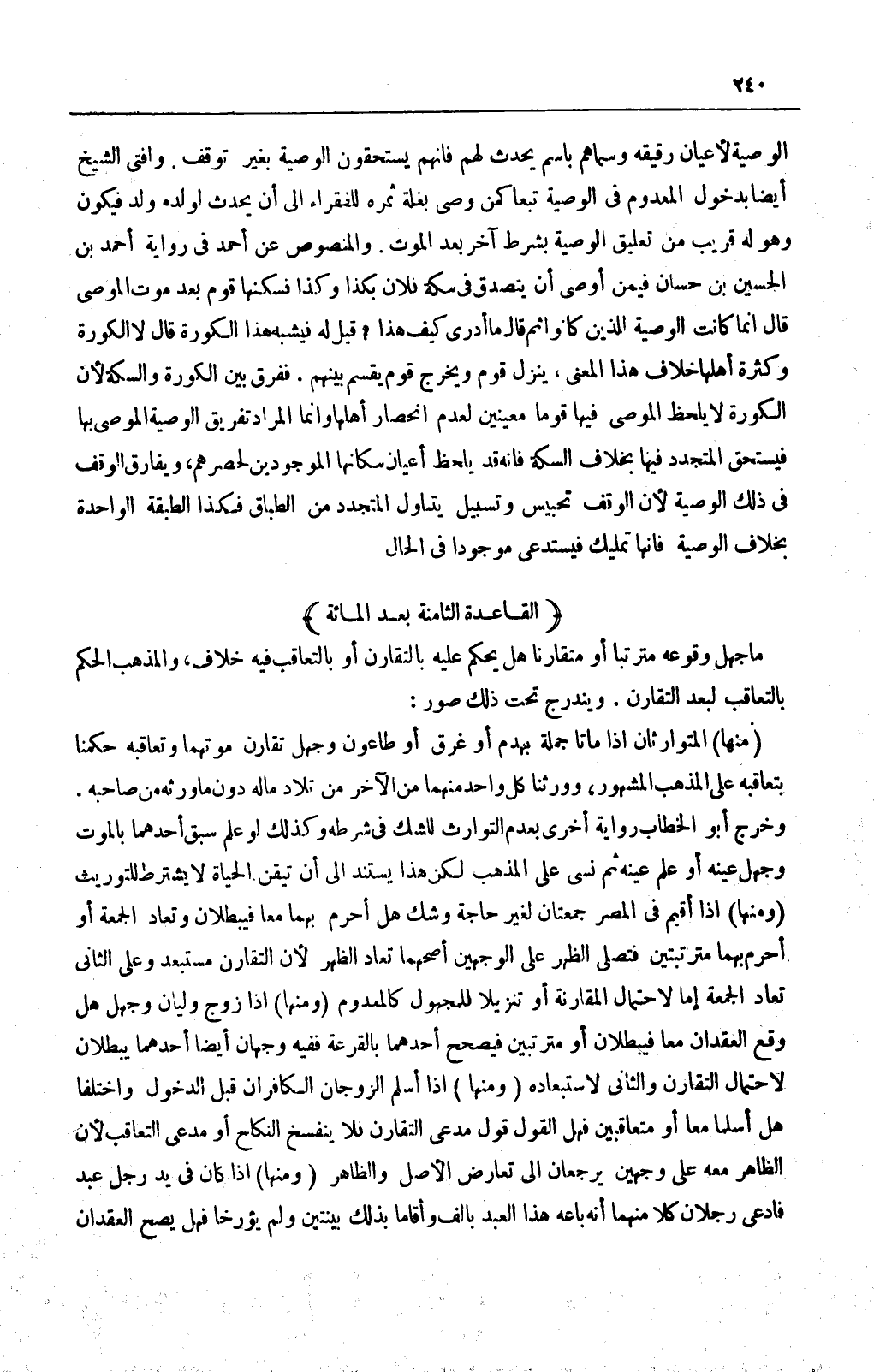 (الْقَاعِدَةُ الثَّامِنَةُ بَعْدَ الْمِائَةِ) : مَا جُهِلَ وُقُوعُهُ مُتَرَتِّبًا أَوْ مُتَقَارِنًا هَلْ يُحْكَمُ عَلَيْهِ بِالتَّقَارُنِ أَوْ بِالتَّعَاقُبِ؟ فِيهِ خِلَافٌ، وَالْمَذْهَبُ الْحُكْمُ بِالتَّعَاقُبِ لِبُعْدِ التَّقَارُنِ. وَيَنْدَرِجُ تَحْتَ ذَلِكَ صُوَرٌ:
