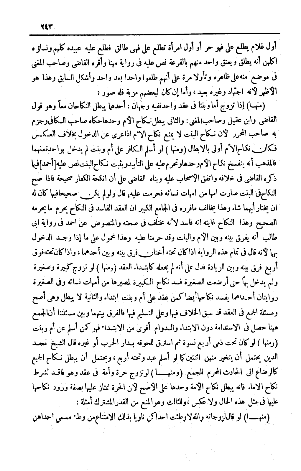 (وَمِنْهَا) لَوْ أَسْلَمَ الْكَافِرُ عَلَى أُمٍّ وَبِنْتٍ لَمْ يَدْخُلْ بِوَاحِدَةٍ مِنْهُمَا فَالْمَذْهَبُ أَنَّهُ يَنْفَسِخُ نِكَاحُ الْأُمِّ وَحْدَهَا وَتَحْرُمُ عَلَيْهِ عَلَى التَّأْبِيدِ وَيَثْبُتُ نِكَاحُ الْبِنْتِ نَصَّ عَلَيْهِ [أَحْمَدُ] فِيمَا ذَكَرَهُ الْقَاضِي فِي خِلَافِهِ وَاتَّفَقَ الْأَصْحَابُ عَلَيْهِ وَبَنَاهُ الْقَاضِي عَلَى أَنَّ أَنْكِحَةَ الْكُفَّارِ صَحِيحَةٌ فَإِذَا صَحَّ النِّكَاحُ فِي الْبِنْتِ صَارَتْ أُمُّهَا مِنْ أُمَّهَاتِ نِسَائِهِ فَحَرُمَتْ عَلَيْهِ، قَالَ: وَلَوْ لَمْ يَكُنْ صَحِيحًا فِيهَا كَانَ لَهُ أَنْ يَخْتَارَ أَيَّهُمَا شَاءَ وَهَذَا يُخَالِفُ مَا قَرَّرَهُ فِي الْجَامِعِ الْكَبِيرِ أَنَّ الْعَقْدَ الْفَاسِدَ فِي النِّكَاحِ يُحَرِّمُ مَا يُحَرِّمُهُ الصَّحِيحُ وَهَذَا النِّكَاحُ غَايَتُهُ أَنَّهُ فَاسِدٌ ; لِأَنَّهُ مُخْتَلَفٌ فِي صِحَّتِهِ وَالْمَنْصُوصُ عَنْ أَحْمَدَ فِي رِوَايَةِ أَبِي طَالِبٍ أَنَّهُ يُفَرِّقُ بَيْنَهُ وَبَيْنَ الْأُمِّ وَالْبِنْتِ وَقَدْ حُرِّمَتَا عَلَيْهِ وَهَذَا مَحْمُولٌ عَلَى مَا إذَا وَجَدَ الدُّخُولَ بِهِمَا ; لِأَنَّهُ قَالَ فِي تَمَامِ هَذِهِ الرِّوَايَةِ: إذَا كَانَ تَحْتَهُ أُخْتَانِ فَرَّقَ بَيْنَهُ وَبَيْنَ أَحَدِهِمَا، وَإِذَا كَانَ تَحْتَهُ فَوْقَ أَرْبَعٍ فَرَّقَ بَيْنَهُ وَبَيْنَ الزِّيَادَةِ فَدَلَّ عَلَى أَنَّهُ لَمْ يَجْعَلْهُ كَابْتِدَاءِ الْعَقْدِ