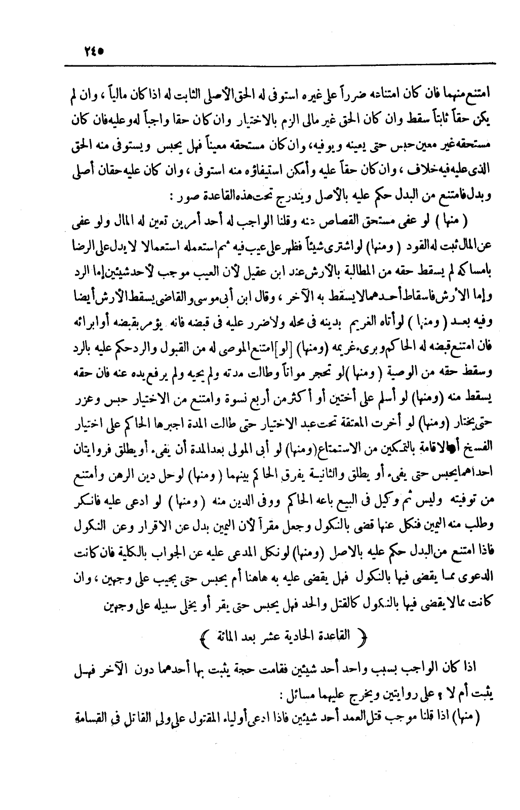 (الْقَاعِدَةُ الْحَادِيَةَ عَشَرَ بَعْدَ الْمِائَةِ) : إذَا كَانَ الْوَاجِبُ بِسَبَبٍ وَاحِدٍ أَحَدَ شَيْئَيْنِ فَقَامَتْ حُجَّةٌ بِهَا أَحَدُهُمَا دُونَ الْآخَرِ فَهَلْ يَثْبُتُ أَمْ لَا؟ عَلَى رِوَايَتَيْنِ وَيُخَرَّجُ عَلَيْهِمَا مَسَائِلُ: (مِنْهَا) إذَا قُلْنَا مُوجَبُ قَتْلِ الْعَمْدِ أَحَدُ شَيْئَيْنِ فَإِذَا ادَّعَى أَوْلِيَاءُ الْمَقْتُولِ عَلَى وَلِيِّ الْقَاتِلِ فِي الْقَسَامَةِ