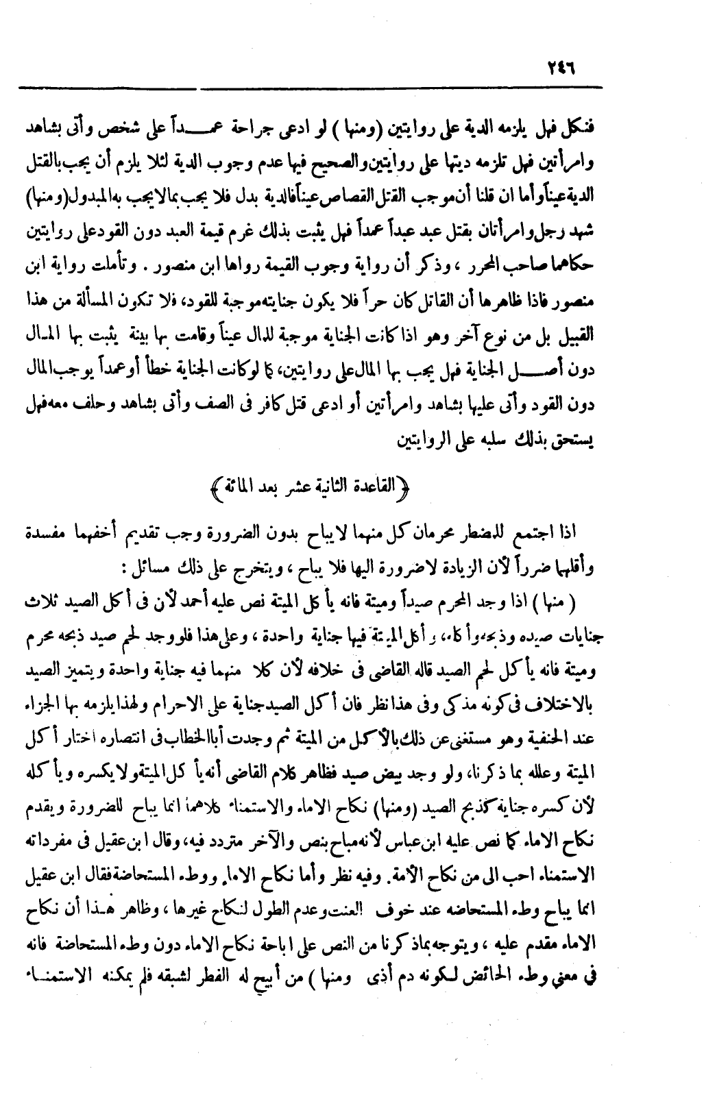 (وَمِنْهَا) شَهِدَ رَجُلٌ وَامْرَأَتَانِ بِقَتْلِ عَبْدٍ عَبْدًا عَمْدًا فَهَلْ يَثْبُتُ بِذَلِكَ غُرْمُ قِيمَةَ الْعَبْدِ دُونَ الْقَوَدِ عَلَى رِوَايَتَيْنِ حَكَاهُمَا صَاحِبُ الْمُحَرَّرِ، وَذَكَرَ أَنَّ رِوَايَةَ وُجُوبِ الْقِيمَةِ رَوَاهَا ابْنُ مَنْصُورٍ. وَتَأَمَّلْتُ رِوَايَةَ ابْنِ مَنْصُورٍ فَإِذَا ظَاهِرُهَا أَنَّ الْقَاتِلَ كَانَ حُرًّا فَلَا يَكُونُ جِنَايَتُهُ مُوجِبَةً لِلْقَوَدِ، فَلَا تَكُونُ الْمَسْأَلَةُ مِنْ هَذَا الْقَبِيلِ بَلْ مِنْ نَوْعٍ آخَرَ وَهُوَ إذَا كَانَتْ الْجِنَايَةُ مُوجِبَةً لِلْمَالِ عَيْنًا وَقَامَتْ بِهَا بَيِّنَةٌ يَثْبُتُ بِهَا الْمَالُ دُونَ أَصْلِ الْجِنَايَةِ فَهَلْ يَجِبُ بِهَا الْمَالُ عَلَى رِوَايَتَيْنِ، كَمَا لَوْ كَانَتْ الْجِنَايَةُ خَطَأً أَوْ عَمْدًا يُوجِبُ الْمَالَ دُونَ الْقَوَدِ وَأَتَى عَلَيْهَا بِشَاهِدٍ وَامْرَأَتَيْنِ أَوْ ادَّعَى قَتْلَ كَافِرٍ فِي الصَّفِّ وَأَتَى بِشَاهِدٍ وَحَلَفَ مَعَهُ فَهَلْ يَسْتَحِقُّ بِذَلِكَ سَلْبَهُ عَلَى الرِّوَايَتَيْنِ
