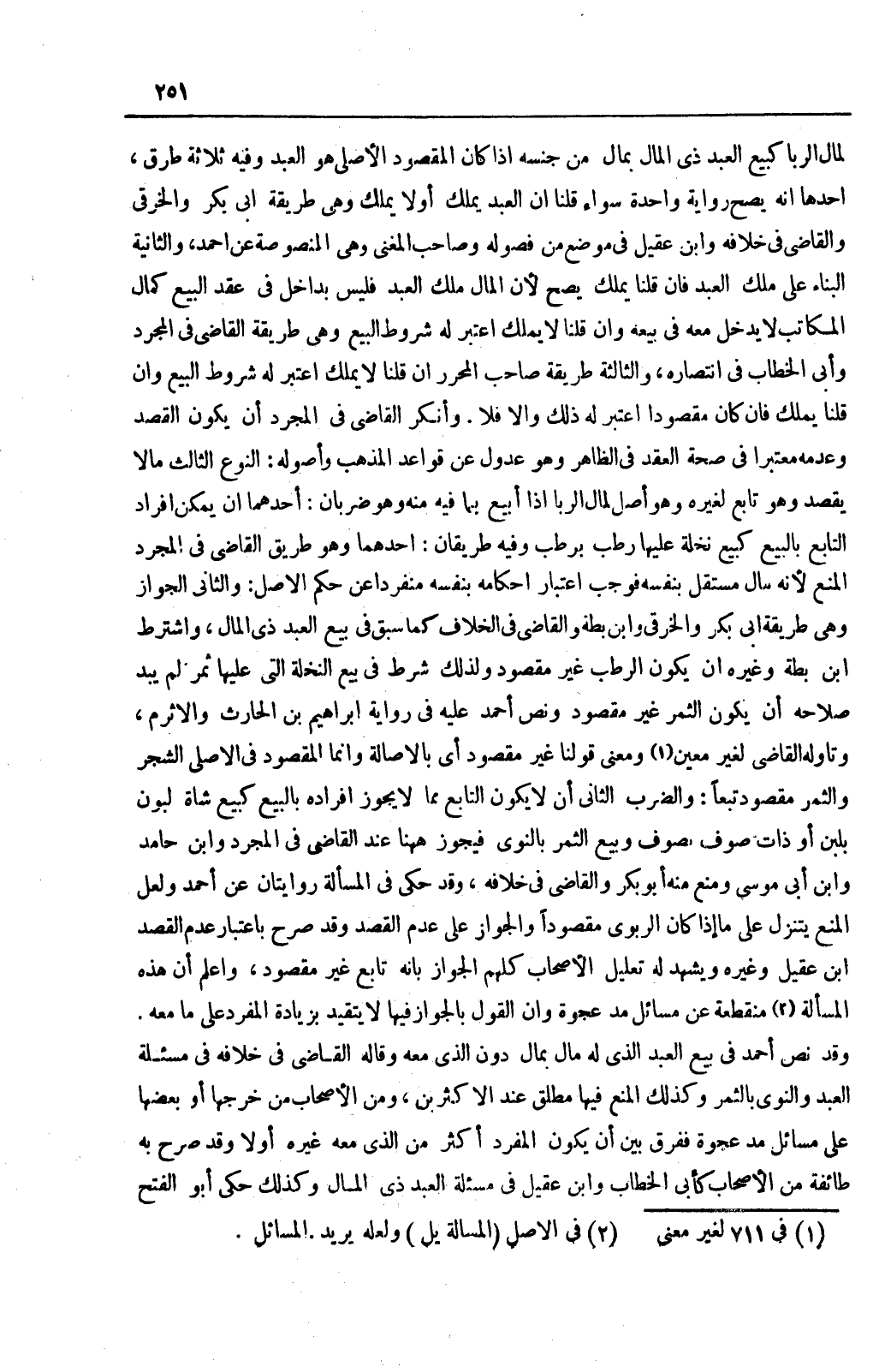 وَقَدْ نَصَّ أَحْمَدُ فِي بَيْعِ الْعَبْدِ الَّذِي لَهُ مَالٌ بِمَالٍ دُون الَّذِي مَعَهُ وَقَالَهُ الْقَاضِي فِي خِلَافِهِ فِي مَسْأَلَةِ الْعَبْدِ وَالنَّوَى بِالثَّمَرِ وَكَذَلِكَ الْمَنْعُ فِيهَا مُطْلَقٌ عِنْدَ الْأَكْثَرِينَ، وَمِنْ الْأَصْحَابِ مَنْ خَرَّجَهَا أَوْ بَعْضَهَا عَلَى مَسَائِلِ مُدِّ عَجْوَةٍ فَفَرَّقَ بَيْنَ أَنْ يَكُونَ الْمُفْرَدُ أَكْثَرَ مِنْ الَّذِي مَعَهُ غَيْرُهُ أَوْ لَا وَقَدْ صَرَّحَ بِهِ طَائِفَةٌ مِنْ الْأَصْحَابِ كَأَبِي الْخَطَّابِ وَابْنِ عَقِيلٍ فِي مَسْأَلَةِ الْعَبْدِ ذِي الْمَالِ وَكَذَلِكَ حَكَى أَبُو الْفَتْحِ الْحَلْوَانِيُّ