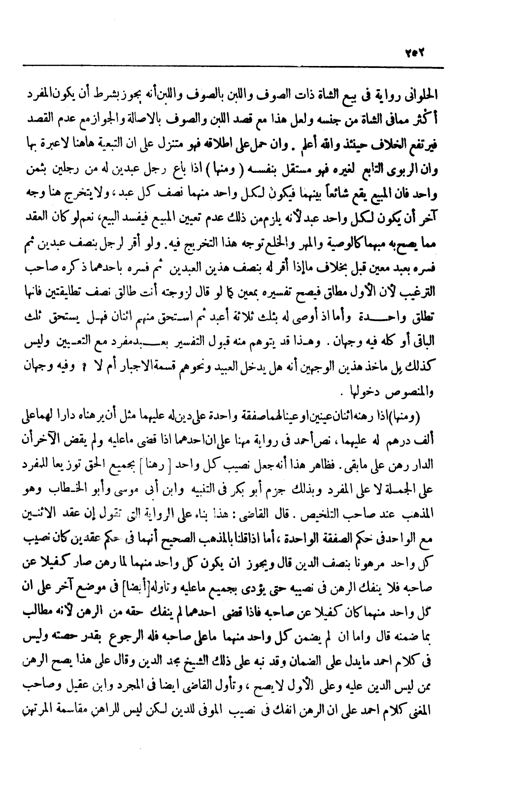 قَالَ: وَأَمَّا إنْ لَمْ يَضْمَنْ كُلُّ وَاحِدٍ مِنْهُمَا مَا عَلَى صَاحِبِهِ فَلَهُ الرُّجُوعُ بِقَدْرِ حِصَّتِهِ. وَلَيْسَ فِي كَلَامِ أَحْمَدَ مَا يَدُلُّ عَلَى الضَّمَانِ وَقَدْ نَبَّهَ عَلَى ذَلِكَ الشَّيْخُ مَجْدُ الدِّينِ وَقَالَ: عَلَى هَذَا يَصِحُّ الرَّهْنُ مِمَّنْ لَيْسَ الدَّيْنُ عَلَيْهِ وَعَلَى الْأَوَّلِ لَا يَصِحُّ، وَتَأَوَّلَ الْقَاضِي أَيْضًا فِي الْمُجَرَّدِ وَابْنُ عَقِيلٍ وَصَاحِبُ الْمُغْنِي كَلَامَ أَحْمَدَ عَلَى أَنَّ الرَّهْنَ انْفَكَّ فِي نَصِيبِ الْمُوفِي لِلدَّيْنِ لَكِنْ لَيْسَ لِلرَّاهِنِ مُقَاسَمَةُ الْمُرْتَهِنِ