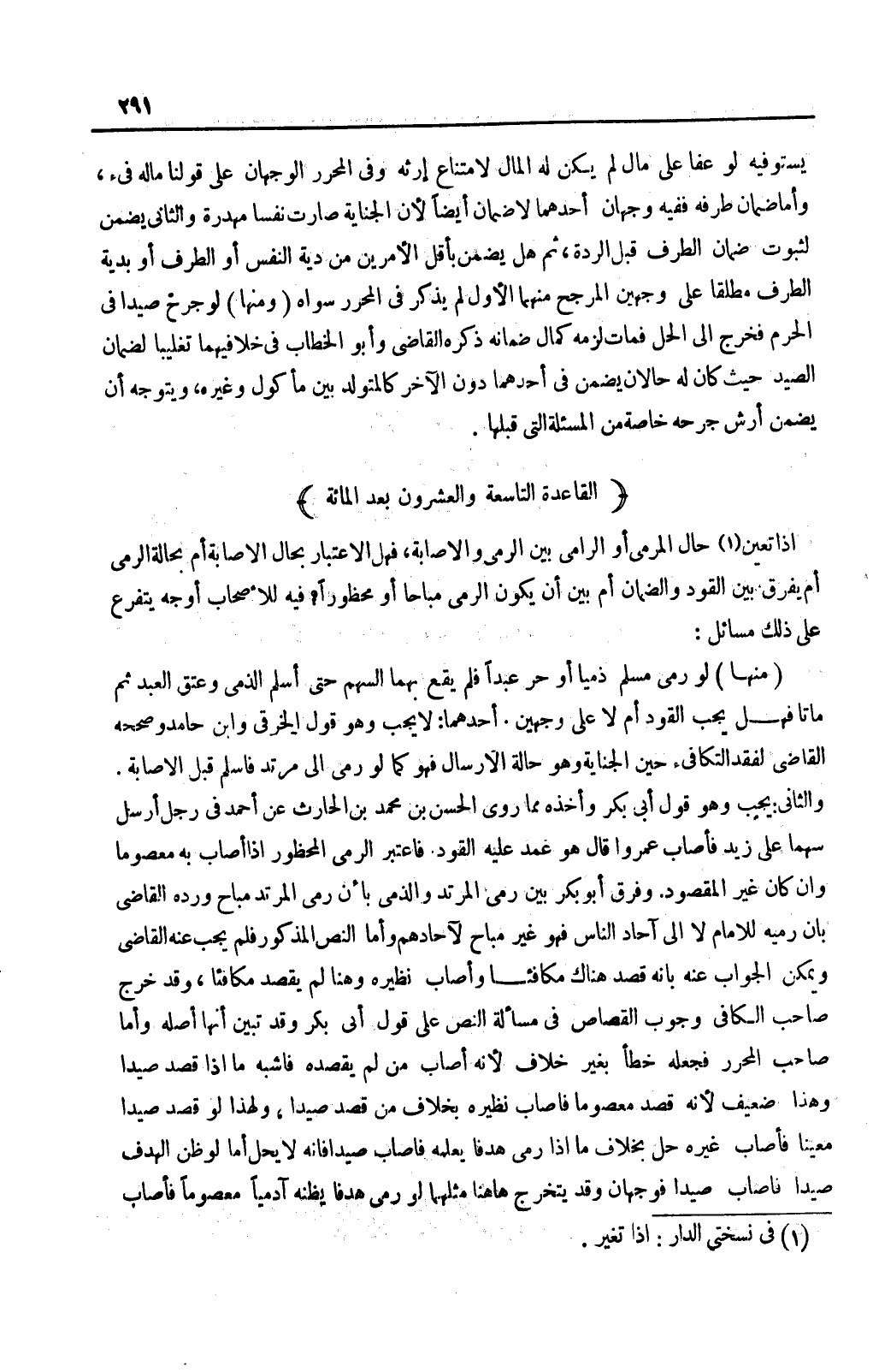 وَمِنْهَا: لَوْ رَمَى إلَى مُرْتَدٍّ أَوْ إلَى حَرْبِيٍّ فَأَسْلَمَا ثُمَّ وَصَلَ إلَيْهِمَا السَّهْمُ فَقَتَلَهُمَا فَلَا قَوَدَ بِغَيْرِ خِلَافٍ ; لِأَنَّ دَمَهُمَا حَالَ الرَّمْيِ كَانَ مُهْدَرًا، وَهَلْ يَجِبُ الضَّمَانُ؟ فِيهِ ثَلَاثَةُ أَوْجُهٍ: أَحَدُهَا: وُجُوبُهُ فِيهِمَا قَالَهُ الْقَاضِي فِي خِلَافِهِ وَالْآمِدِيُّ وَأَبُو الْخَطَّابِ فِي مَوْضِعٍ مِنْ الْهِدَايَةِ، وَعَزَاهُ غَيْرُ وَاحِدٍ إلَى الْخِرَقِيِّ اعْتِبَارًا بِحَالَةِ الْإِصَابَةِ وَهُمَا حِينَئِذٍ مُسْلِمَانِ مَعْصُومَانِ، وَلَا أَثَرَ لِانْتِفَاءِ الْعِصْمَةِ حَالَ السَّبَبِ، كَمَا لَوْ حَفَرَ بِئْرًا لَهُمَا فَوَقَعَا فِيهَا بَعْدَ إسْلَامِهِمَا فَإِنَّهُ يَضْمَنُهَا بِغَيْرِ خِلَافٍ ذَكَرَهُ الْقَاضِي وَغَيْرُهُ قَالَ الْقَاضِي: وَلَا نُسَلِّمُ أَنَّ رَمْيَ الْحَرْبِيِّ وَالْمُرْتَدِّ مُبَاحٌ مُطْلَقًا بَلْ هُوَ مُرَاعًا فَإِنْ أَسْلَمَ قَبْلَ الْوُقُوعِ تَبَيَّنَّا أَنَّهُ لَمْ يَكُنْ مُبَاحًا.