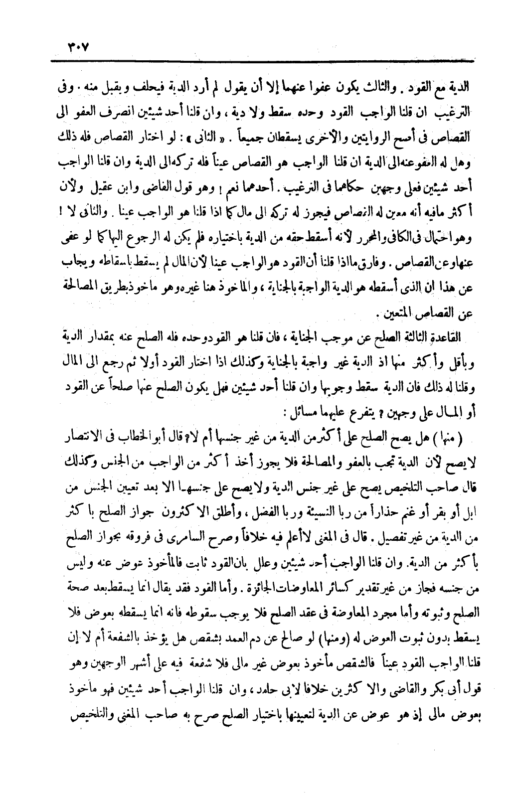 (مِنْهَا) هَلْ يَصِحُّ الصُّلْحُ عَلَى أَكْثَرَ مِنْ الدِّيَةِ مِنْ غَيْرِ جِنْسهَا أَمْ لَا؟ قَالَ أَبُو الْخَطَّابِ فِي الِانْتِصَارِ لَا يَصِحُّ لِأَنَّ الدِّيَةَ تَجِبُ بِالْعَفْوِ وَالْمُصَالَحَةِ فَلَا يَجُوزُ أَخْذُ أَكْثَرَ مِنْ الْوَاجِبِ مِنْ الْجِنْسِ وَكَذَلِكَ قَالَ صَاحِبُ التَّلْخِيصِ يَصِحُّ غَيْرُ جِنْسِ الدِّيَةِ وَلَا يَصِحُّ عَلَى جِنْسِهَا إلَّا بَعْدَ تَعْيِينِ الْجِنْسِ مِنْ إبِلٍ أَوْ بَقَرٍ أَوْ غَنَمٍ أُعْطِيَ مِنْ رِبَا النَّسِيئَةِ وَرِبَا الْفَضْلِ، وَأَطْلَقَ الْأَكْثَرُونَ جَوَازَ الصُّلْحِ بِأَكْثَرَ مِنْ الدِّيَةِ مِنْ غَيْرِ تَفْصِيلٍ.