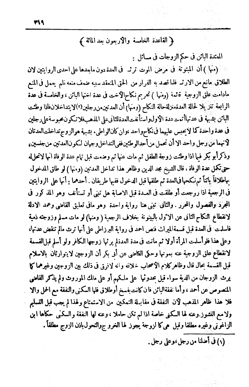 وَمِنْهَا: لَوْ مَاتَ مُسْلِمٌ وَزَوْجَتُهُ ذِمِّيَّةٌ فَأَسْلَمَتْ فِي الْعِدَّةِ قَبْلَ قِسْمَةِ الْمِيرَاثِ فَنَصَّ أَحْمَدُ فِي رِوَايَةِ البرزاطي عَلَى أَنَّهَا تَرِثُ مَا لَمْ تُنْقَضْ عِدَّتُهَا، وَعَلَى هَذَا فَلَوْ أَسْلَمَتْ الْمَرْأَةُ أَوَّلًا ثُمَّ مَاتَتْ فِي مُدَّةِ الْعِدَّةِ لَمْ يَرِثْهَا زَوْجُهَا الْكَافِرُ وَلَوْ أَسْلَمَ قَبْلَ الْقِسْمَةِ لِانْقِطَاعِ عُلَقِ الزَّوْجِيَّةِ عَنْهُ بِمَوْتِهَا، وَحَكَى الْقَاضِي عَنْ أَبِي بَكْرٍ أَنَّ الزَّوْجَيْنِ لَا يَتَوَارَثَانِ بِالْإِسْلَامِ قَبْلَ الْقِسْمَةِ بِحَالٍ، قَالَ وَظَاهِرُ كَلَامِ الْأَصْحَابِ خِلَافُهُ وَأَنَّهُ لَا فَرْقَ فِي ذَلِكَ بَيْنَ الزَّوْجَيْنِ وَغَيْرِهِمَا كَمَا يَرِثُ الزَّوْجَانِ مِنْ الدِّيَةِ سَوَاءٌ قِيلَ بِحُدُوثِهَا عَلَى مِلْكِهِمْ أَوْ عَلَى مِلْكِ الْمَوْرُوثِ، وَلَمْ يَذْكُرْ الْقَاضِي الْمَنْصُوصَ عَنْ أَحْمَدَ، وَأَمَّا نَفَقَةُ الْبَائِنِ فَإِنْ كَانَتْ بِفَسْخٍ أَوْ طَلَاقٍ فَلَهَا السُّكْنَى وَالنَّفَقَةُ مَعَ الْحَمْلِ وَإِلَّا فَلَا، هَذَا ظَاهِرُ الْمَذْهَبِ ; لِأَنَّ النَّفَقَةَ فِي مُقَابَلَةِ التَّمْكِينِ مِنْ الِاسْتِمْتَاعِ وَلِهَذَا لَمْ يَجِبْ قَبْلَ التَّسْلِيمِ وَلَا مَعَ النُّشُوزِ وَعَنْهُ لَهَا السُّكْنَى خَاصَّةً إذَا لَمْ تَكُنْ حَامِلًا، وَعَنْهُ لَهَا النَّفَقَةُ وَالسُّكْنَى حَكَاهَا ابْنُ الزاغوني وَغَيْرُهُ مُطْلَقًا، وَقِيلَ هِيَ كَالزَّوْجَةِ يَجُوزُ لَهَا الْخُرُوجُ وَالتَّجَوُّلُ بِإِذْنِ الزَّوْجِ مُطْلَقًا.