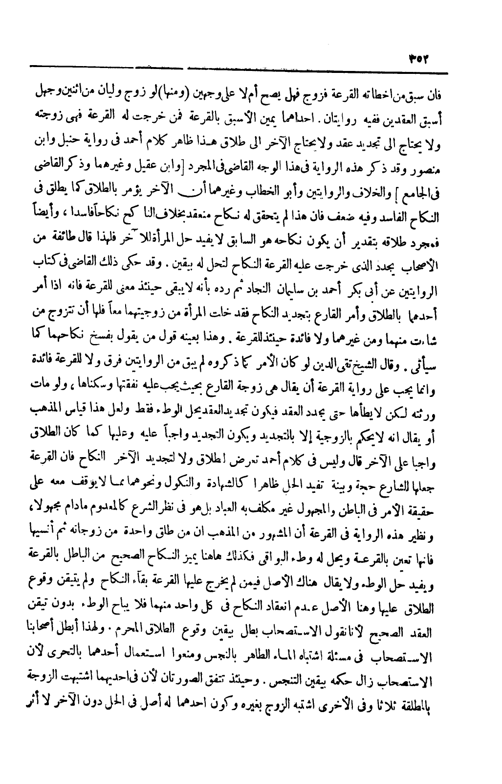وَقَدْ حَكَى ذَلِكَ الْقَاضِي فِي كِتَابِ الرِّوَايَتَيْنِ عَنْ أَبِي بَكْرٍ أَحْمَدَ بْنِ سُلَيْمَانَ النَّجَّادِ ثُمَّ رَدَّهُ بِأَنَّهُ لَا يَبْقَى حِينَئِذٍ مَعْنَى لِلْقُرْعَةِ فَإِنَّهُ إذَا أَمَرَ أَحَدُهُمَا بِالطَّلَاقِ وَأَمَرَ الْقَارِعَ بِتَجْدِيدِ النِّكَاحِ فَقَدْ خَلَتْ الْمَرْأَةُ مِنْ زَوْجِيَّتِهِمَا مَعًا، فَلَهَا أَنْ تَتَزَوَّجَ مَنْ شَاءَتْ مِنْهُمَا وَمِنْ غَيْرِهِمَا. وَلَا فَائِدَةَ حِينَئِذٍ لِلْقُرْعَةِ. وَهَذَا بِعَيْنِهِ قَوْلُ مِنْ يَقُولُ بِفَسْخِ نِكَاحِهِمَا كَمَا سَيَأْتِي. وَقَالَ الشَّيْخُ تَقِيُّ الدِّينِ لَوْ كَانَ الْأَمْرُ كَمَا ذَكَرُوهُ لَمْ يَبْقَ مِنْ الرِّوَايَتَيْنِ فَرْقٌ وَلَا لِلْقُرْعَةِ فَائِدَةٌ، وَإِنَّمَا يَجِبُ عَلَى رِوَايَةِ الْقُرْعَةِ أَنْ يُقَالَ: هِيَ زَوْجَةُ الْقَارِعِ بِحَيْثُ يَجِبُ عَلَيْهِ نَفَقَتُهَا وَسُكْنَاهَا، وَلَوْ مَاتَ وَرِثَتْهُ، لَكِنْ لَا يَطَؤُهَا حَتَّى يُجَدِّدَ الْعَقْدَ فَيَكُونَ تَجْدِيدُ الْعَقْدِ يُحِلُّ الْوَطْءَ فَقَطْ.