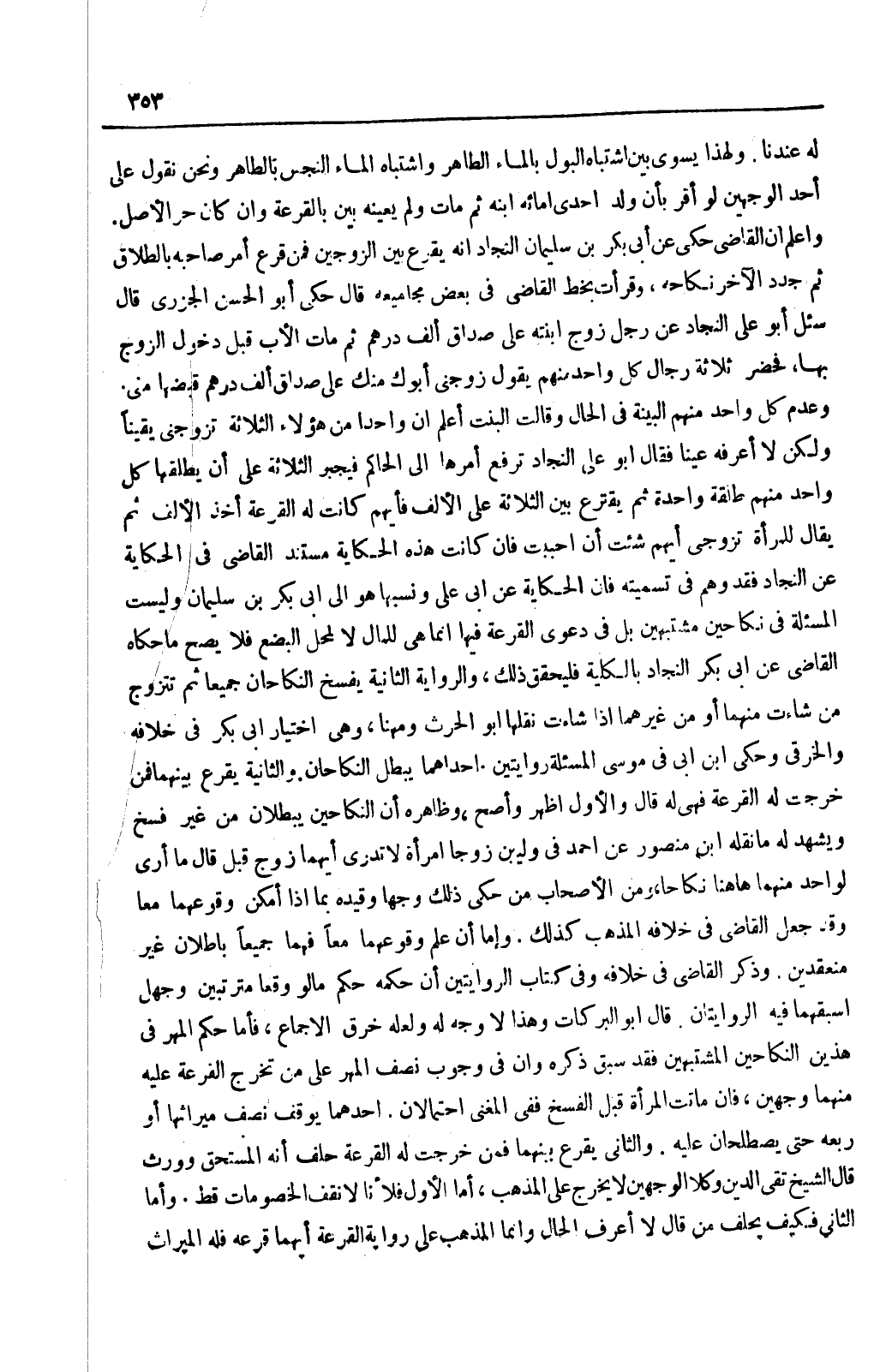 وَاعْلَمْ أَنَّ الْقَاضِيَ حَكَى عَنْ أَبِي بَكْرِ بْنِ سُلَيْمَانَ النَّجَّادِ أَنَّهُ يُقْرَعُ بَيْنَ الزَّوْجَيْنِ فَمَنْ قُرِعَ أُمِرَ صَاحِبُهُ بِالطَّلَاقِ ثُمَّ جَدَّدَ الْآخَرُ نِكَاحَهُ، وَقَرَأْتُ بِخَطِّ الْقَاضِي فِي بَعْضِ مَجَامِيعِهِ قَالَ: حَكَى أَبُو الْحَسَنِ الْجَزَرِيُّ قَالَ سُئِلَ أَبُو عَلِيٍّ النَّجَّادُ عَنْ رَجُلٍ زَوَّجَ ابْنَتَهُ عَلَى صَدَاقٍ أَلْفِ دِرْهَمٍ ثُمَّ مَاتَ الْأَبُ قَبْلَ دُخُولِ الزَّوْجِ بِهَا، فَحَضَرَ ثَلَاثَةُ رِجَالٍ كُلُّ وَاحِدٍ مِنْهُمْ يَقُولُ زَوَّجَنِي أَبُوك مِنْك عَلَى صَدَاقٍ أَلْفِ دِرْهَمٍ قَبَضَهَا مِنِّي، وَعَدِمَ كُلُّ وَاحِدٍ مِنْهُمْ الْبَيِّنَةَ فِي الْحَالِ وَقَالَتْ الْبِنْتُ: أَعْلَمُ أَنَّ وَاحِدًا مِنْ هَؤُلَاءِ الثَّلَاثَةِ تَزَوَّجَنِي يَقِينًا وَلَكِنْ لَا أَعْرِفُهُ عَيْنًا فَقَالَ أَبُو عَلِيٍّ النَّجَّادُ تَرْفَعُ أَمْرَهَا إلَى الْحَاكِمِ فَيُجْبَرُ الثَّلَاثَةُ عَلَى أَنْ يُطَلِّقَهَا كُلُّ وَاحِدٍ مِنْهُمْ طَلْقَةً وَاحِدَةً ثُمَّ يَقْتَرِعُ بَيْنَ الثَّلَاثَةِ عَلَى الْأَلْفِ فَأَيُّهُمْ كَانَتْ لَهُ الْقُرْعَةُ أَخَذَ الْأَلْفَ ثُمَّ يُقَالُ لِلْمَرْأَةِ: تَزَوَّجِي أَيَّهمْ شِئْت إنْ أَحْبَبْتِ فَإِنْ كَانَتْ هَذِهِ الْحِكَايَةُ مُسْتَنَدَ الْقَاضِي فِي الْحِكَايَةِ عَنْ النَّجَّادِ فَقَدْ وَهَمَ فِي تَسْمِيَتِهِ ; فَإِنَّ الْحِكَايَةَ عَنْ أَبِي عَلِيٍّ وَنَسَبَهَا هُوَ إلَى أَبِي بَكْرِ بْنِ سُلَيْمَانَ وَلَيْسَتْ الْمَسْأَلَةُ فِي نِكَاحَيْنِ مُشْتَبِهَيْنِ بَلْ فِي دَعْوَى الْقُرْعَةِ فِيهَا إنَّمَا هِيَ لِلْمَالِ لَا لِمَحَلِّ الْبُضْعِ فَلَا يَصِحُّ مَاحَكَاهُ الْقَاضِي عَنْ أَبِي بَكْرٍ النَّجَّادِ بِالْكُلِّيَّةِ فَلْيُحَقَّقْ ذَلِكَ، وَالرِّوَايَةُ الثَّانِيَة يُفْسَخُ النِّكَاحَانِ جَمِيعًا ثُمَّ تَتَزَوَّجُ مَنْ شَاءَتْ مِنْهُمَا أَوْ مِنْ غَيْرِهِمَا إذَا شَاءَتْ نَقَلَهَا أَبُو الْحَارِثِ وَمُهَنَّا، وَهِيَ اخْتِيَارُ أَبِي بَكْرٍ فِي خِلَافِهِ وَالْخِرَقِيِّ.