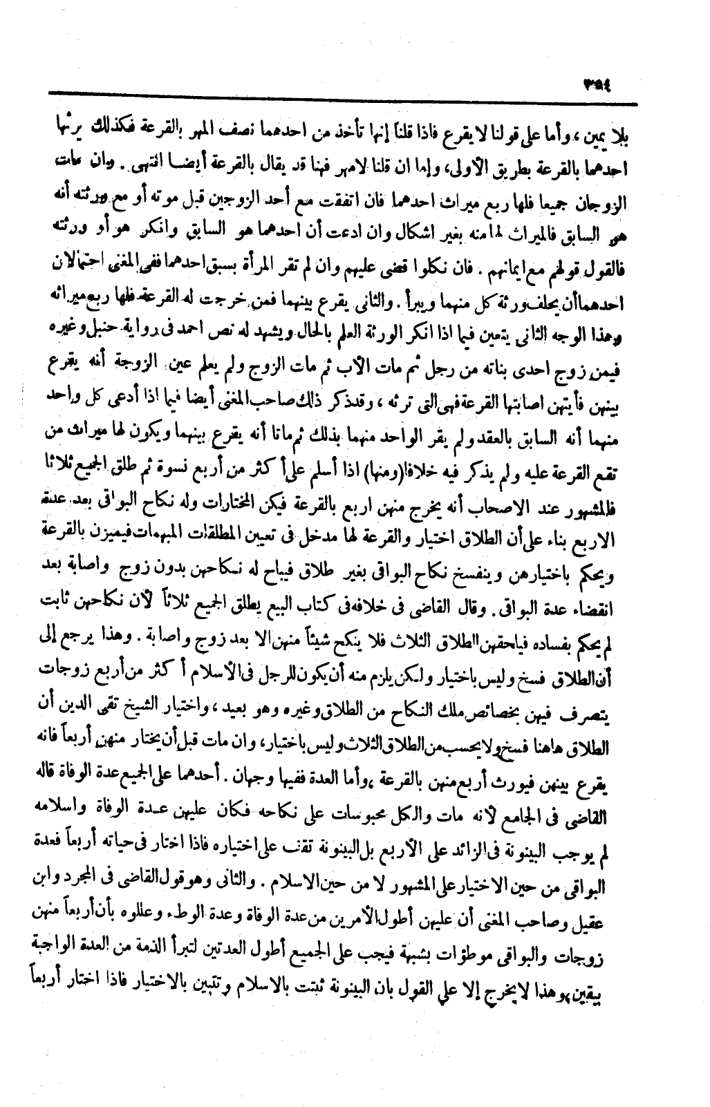(وَمِنْهَا) إذَا أَسْلَمَ عَلَى أَكْثَرَ مِنْ أَرْبَعِ نِسْوَةٍ ثُمَّ طَلَّقَ الْجَمِيعَ ثَلَاثًا فَالْمَشْهُورُ عِنْدَ الْأَصْحَابِ أَنَّهُ يَخْرُجُ مِنْهُنَّ أَرْبَعٌ بِالْقُرْعَةِ فَيَكُنَّ الْمُخْتَارَاتِ وَلَهُ نِكَاحُ الْبَوَاقِي بَعْدَ عِدَّةِ الْأَرْبَعِ بِنَاءً عَلَى أَنَّ الطَّلَاقَ اخْتِيَارٌ وَالْقُرْعَةَ لَهَا مَدْخَلٌ فِي تَعْيِينِ الْمُطَلَّقَاتِ الْمُبْهَمَاتِ فَيُمَيَّزْنَ بِالْقُرْعَةِ وَيُحْكَمُ بِاخْتِيَارِهِنَّ وَيَنْفَسِخُ نِكَاحُ الْبَوَاقِي بِغَيْرِ طَلَاقٍ فَيُبَاحُ لَهُ نِكَاحُهُنَّ بِدُونِ زَوْجٍ وَإِصَابَةٍ بَعْدَ انْقِضَاءِ عِدَّةِ الْبَوَاقِي. وَقَالَ الْقَاضِي فِي خِلَافِهِ فِي كِتَابِ الْبَيْعِ: يُطَلَّقُ الْجَمِيعَ ثَلَاثًا لِأَنَّ نِكَاحَهُنَّ ثَابِتٌ لَمْ يُحْكَمْ بِفَسَادِهِ فَيَلْحَقُهُنَّ الطَّلَاقُ الثَّلَاثُ فَلَا يَنْكِحُ شَيْئًا مِنْهُنَّ إلَّا بَعْدَ زَوْجٍ وَإِصَابَةٍ. وَهَذَا يَرْجِعُ إلَى أَنَّ الطَّلَاقَ فَسْخٌ وَلَيْسَ بِاخْتِيَارٍ وَلَكِنْ يَلْزَمُ مِنْهُ أَنْ يَكُونَ لِلرَّجُلِ فِي الْإِسْلَامِ أَكْثَرُ مِنْ أَرْبَعِ زَوْجَاتٍ يَتَصَرَّفُ فِيهِنَّ بِخَصَائِصِ مِلْكِ النِّكَاحِ مِنْ الطَّلَاقِ وَغَيْرِهِ وَهُوَ بَعِيدٌ، وَاخْتِيَارُ الشَّيْخِ تَقِيِّ الدِّينِ أَنَّ الطَّلَاقَ هُنَا فَسْخٌ وَلَا يُحْسَبُ مِنْ الطَّلَاقِ الثَّلَاثِ وَلَيْسَ بِاخْتِيَارٍ، وَإِنْ مَاتَ قَبْلَ أَنْ يَخْتَارَ مِنْهُنَّ أَرْبَعًا فَإِنَّهُ يُقْرَعُ بَيْنَهُنَّ فَيُوَرَّثُ أَرْبَعٌ مِنْهُنَّ بِالْقُرْعَةِ، وَأَمَّا الْعِدَّةُ فَفِيهَا وَجْهَانِ: