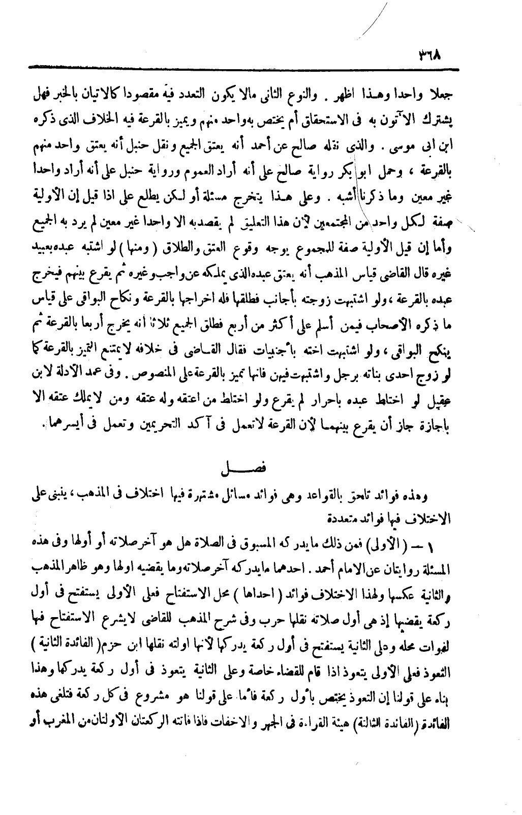 فَصْلٌ وَهَذِهِ فَوَائِدُ تُلْحَقُ بِالْقَوَاعِدِ وَهِيَ فَوَائِدُ مَسَائِلَ مُشْتَهِرَةٍ فِيهَا اخْتِلَافٌ فِي الْمَذْهَبِ يَنْبَنِي عَلَى الِاخْتِلَافِ فِيهَا فَوَائِدُ مُتَعَدِّدَةٌ (الْأُولَى) فَمِنْ ذَلِكَ مَا يُدْرِكُهُ الْمَسْبُوقُ فِي الصَّلَاةِ هَلْ هُوَ آخِرُ صَلَاتِهِ أَوْ أَوَّلُهَا وَفِي هَذِهِ الْمَسْأَلَةِ رِوَايَتَانِ عَنْ الْإِمَامِ أَحْمَدَ: