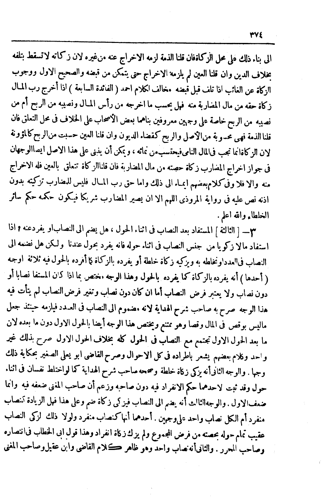 [الثَّالِثَةُ] الْمُسْتَفَادُ بَعْدَ النِّصَابِ فِي أَثْنَاءِ الْحَوْلِ، هَلْ يُضَمُّ إلَى النِّصَابِ أَوْ يُفْرَدُ عَنْهُ؟ إذَا اسْتَفَادَ مَالًا زَكَوِيًّا مِنْ جِنْسِ النِّصَابِ فِي أَثْنَاءِ حَوْلِهِ فَإِنَّهُ يُفْرَدُ بِحَوْلٍ عِنْدَنَا وَلَكِنْ هَلْ نَضُمُّهُ إلَى النِّصَابِ فِي الْعَدَدِ وَنَخْلِطُهُ بِهِ وَيُزَكِّيهِ زَكَاةً خَالِطَةً أَوْ يُفْرِدُهُ بِالزَّكَاةِ كَمَا أَفْرَدَهُ بِالْحَوْلِ فِيهِ ثَلَاثَةُ أَوْجُهٍ: