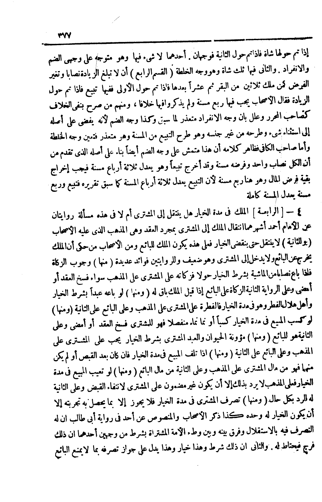 وَلِلرِّوَايَتَيْنِ فَوَائِدُ عَدِيدَةٌ (مِنْهَا) وُجُوبُ الزَّكَاةِ فَإِذَا بَاعَ نِصَابًا مِنْ الْمَاشِيَةِ بِشَرْطِ الْخِيَارِ حَوْلًا فَزَكَاتُهُ عَلَى الْمُشْتَرِي عَلَى الْمَذْهَبِ سَوَاءٌ فَسَخَ الْعَقْدَ أَوْ أَمْضَى، وَعَلَى الرِّوَايَةِ الثَّانِيَةِ: الزَّكَاةُ عَلَى الْبَائِعِ إذَا قِيلَ: الْمِلْكُ بَاقٍ لَهُ.