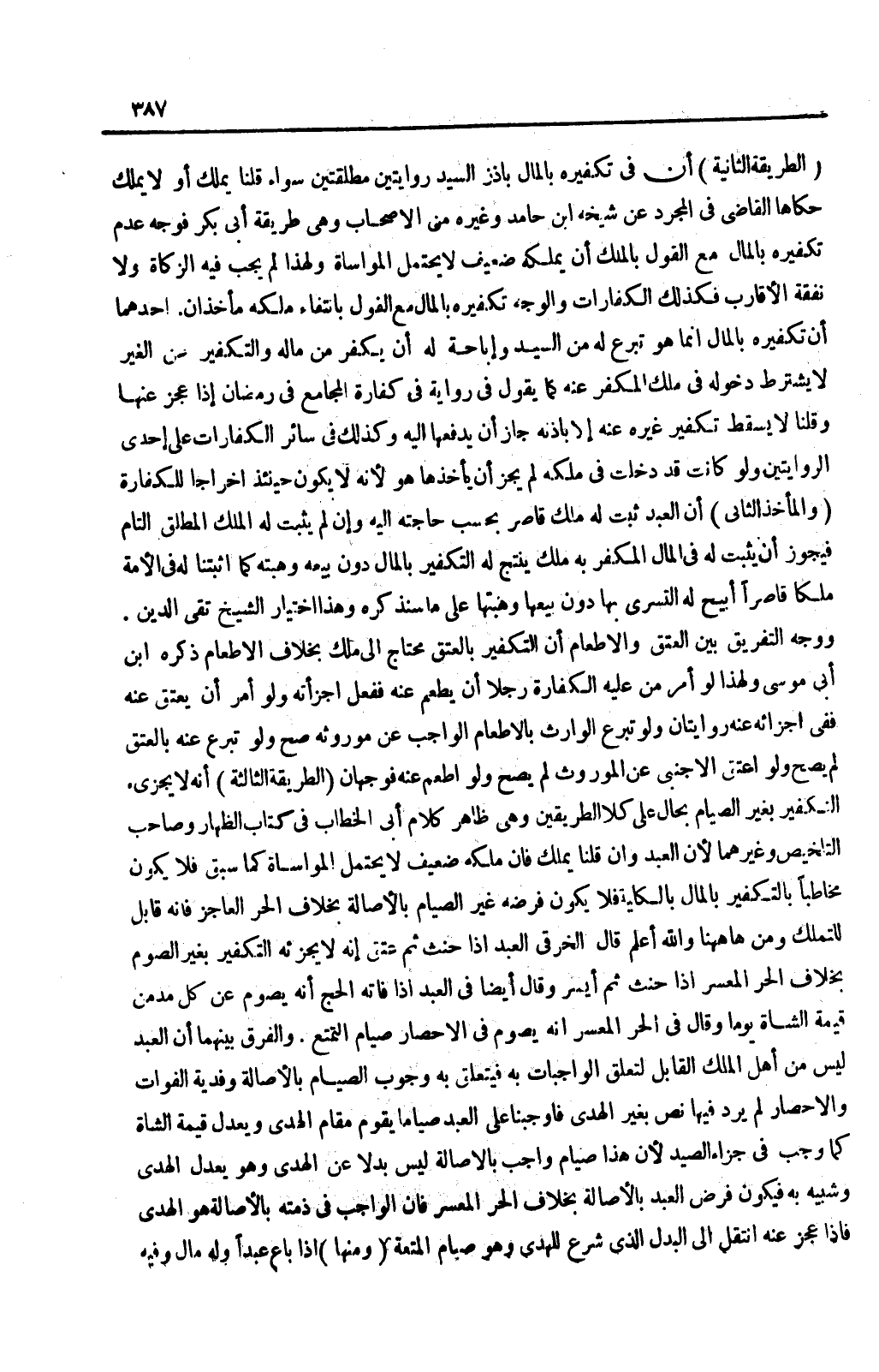 (الطَّرِيقَةُ الثَّانِيَةُ) : أَنَّ فِي تَكْفِيرِهِ بِالْمَالِ بِإِذْنِ السَّيِّدِ رِوَايَتَيْنِ مُطْلَقَتَيْنِ سَوَاءٌ قُلْنَا يَمْلِكُ أَوْ لَا يَمْلِكُ حَكَاهَا الْقَاضِي فِي الْمُجَرَّدِ عَنْ شَيْخِهِ ابْنِ حَامِدٍ وَغَيْرِهِ مِنْ الْأَصْحَابِ وَهِيَ طَرِيقَةُ أَبِي بَكْرٍ فَوَجْهُ عَدَمِ تَكْفِيرِهِ بِالْمَالِ مَعَ الْقَوْلِ بِالْمِلْكِ أَنْ يَمْلِكَهُ ضَعِيفٌ لَا يَحْتَمِلُ الْمُوَاسَاة وَلِهَذَا لَمْ يَجِبْ فِيهِ الزَّكَاةُ وَلَا نَفَقَةُ الْأَقَارِبِ فَكَذَلِكَ الْكَفَّارَاتُ وَالْوَجْهُ تَكْفِيرُهُ بِالْمَالِ مَعَ الْقَوْلِ بِانْتِفَاءِ مِلْكِهِ. مَأْخَذَانِ: