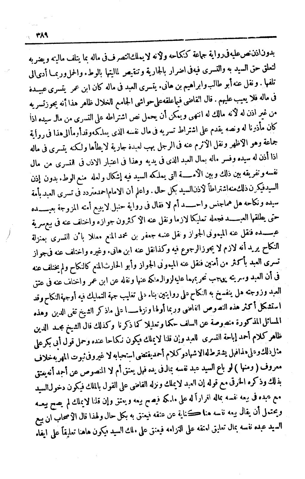 وَاعْلَمْ أَنَّ الْإِمَامَ أَحْمَدَ مُتَرَدِّدٌ فِي تَسَرِّي الْعَبْدِ بِأَمَةِ سَيِّدِهِ وَنِكَاحِهِ هَلْ هُمَا جِنْسٌ وَاحِدٌ أَمْ لَا فَقَالَ فِي رِوَايَةِ حَنْبَلٍ: لَا يَبِيعُ أَمَتَهُ الْمُزَوَّجَةَ بِعَبْدِهِ حَتَّى يُطَلِّقَهَا الْعَبْدُ فَجَعَلَهُ تَمْلِيكًا لَازِمًا وَنَقَلَ عَنْهُ الْأَكْثَرُونَ جَوَازَهُ وَاخْتَلَفَ عَنْهُ فِي بَيْعِ سُرِّيَّةِ عَبْدِهِ فَنَقَلَ عَنْهُ الْمَيْمُونِيُّ الْجَوَازَ وَنَقَلَ عَنْهُ جَعْفَرُ بْنُ مُحَمَّدٍ الْمَنْعَ مُعَلَّلًا بِأَنَّ التَّسَرِّي بِمَنْزِلَةِ النِّكَاحِ يُرِيدُ أَنَّهُ لَازِمٌ لَا يَجُوزُ الرُّجُوعُ فِيهِ وَكَذَا نَقَلَ عَنْهُ ابْنُ هَانِئٍ وَغَيْرُهُ وَاخْتُلِفَ عَنْهُ فِي جَوَازِ تَسَرِّي الْعَبْدِ بِأَكْثَرَ مِنْ أَمَتَيْنِ فَنَقَلَ عَنْهُ الْمَيْمُونِيُّ الْجَوَازَ وَأَبُو الْحَارِثِ الْمَنْعَ كَالنِّكَاحِ، وَلَمْ يَخْتَلِفْ عَنْهُ فِي أَنَّ الْعَبْدَ وَسُرِّيَّتَهُ يُوجِبُ تَحْرِيمَهُمَا عَلَيْهِ لِزَوَالِ مِلْكِهِ عَنْهَا وَنَقَلَهُ عَنْ ابْنِ عُمَرَ وَاخْتَلَفَ عَنْهُ فِي عِتْقِ الْعَبْدِ وَزَوْجَتِهِ هَلْ يَنْفَسِخُ بِهِ النِّكَاحُ؟ عَلَى رِوَايَتَيْنِ بِنَاءً عَلَى تَغْلِيبِ جِهَةِ التَّمْلِيكِ فِيهِ أَوْ جِهَةِ النِّكَاحِ وَقَدْ اسْتَشْكَلَ أَكْثَرَ هَذِهِ النُّصُوصِ الْقَاضِي وَرُبَّمَا أَوَّلَهَا وَنَزَّلَهَا عَلَى مَا ذَكَرَ الشَّيْخُ تَقِيُّ الدِّينِ وَهَذِهِ الْمَسَائِلُ الْمَذْكُورَةُ مَنْصُوصَةٌ عَنْ السَّلَفِ حُكْمًا وَتَعْلِيلًا كَمَا ذَكَرْنَا وَكَذَلِكَ قَالَ الشَّيْخُ مَجْدُ الدِّينِ ظَاهِرُ كَلَامِ أَحْمَدَ إبَاحَةُ التَّسَرِّي لِلْعَبْدِ وَإِنْ قُلْنَا: لَا يَمْلِكُ فَيَكُونُ نِكَاحًا عِنْدَهُ وَحُمِلَ قَوْلُ أَبِي بَكْرٍ عَلَى مِثْلِ ذَلِكَ وَعَلَى هَذَا فَهَلْ يُشْتَرَطُ لَهُ الْإِشْهَادُ وَكَلَامُ أَحْمَدَ يَقْتَضِي اسْتِحْبَابَهُ لَا غَيْرَ وَفِي ثُبُوتِ الْمَهْرِ بِهِ خِلَافٌ مَعْرُوفٌ