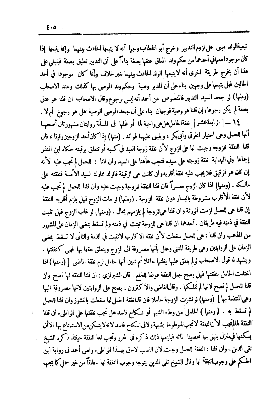 [الرَّابِعَةُ عَشَرَ] نَفَقَةُ الْحَامِلِ هَلْ هِيَ وَاجِبَةٌ لَهَا أَوْ لِحَمْلِهَا فِي الْمَسْأَلَةِ رِوَايَتَانِ مَشْهُورَتَانِ أَصَحُّهُمَا أَنَّهَا لِلْحَمْلِ وَهِيَ اخْتِيَارُ الْخِرَقِيِّ وَأَبِي بَكْرٍ، وَيَنْبَنِي عَلَيْهَا فَوَائِدُ. (مِنْهَا) إذَا كَانَ أَحَدُ الزَّوْجَيْنِ رَقِيقًا، فَإِنْ قُلْنَا النَّفَقَةُ لِلزَّوْجَةِ وَجَبَتْ لَهَا عَلَى الزَّوْجِ ; لِأَنَّ نَفَقَةَ زَوْجَةِ الْعَبْدِ فِي كَسْبِهِ أَوْ تَتَعَلَّقُ بِرَقَبَتِهِ حَكَاهُ ابْنُ الْمُنْذِرِ إجْمَاعًا وَفِي الْهِدَايَةِ نَفَقَةُ زَوْجَتِهِ عَلَى سَيِّدِهِ فَتَجِبُ هَاهُنَا عَلَى السَّيِّدِ وَإِنْ قُلْنَا: لِلْحَمْلِ لَمْ تَجِبْ عَلَيْهِ ; لِأَنَّهُ إنْ كَانَ هُوَ الرَّقِيقَ فَلَا يَجِبُ عَلَيْهِ نَفَقَةُ أَقَارِبَةِ وَإِنْ كَانَتْ هِيَ الرَّقِيقَةَ فَالْوَلَدُ مَمْلُوكٌ لِسَيِّدِ الْأَمَةِ فَنَفَقَتُهُ عَلَى مَالِكِهِ.