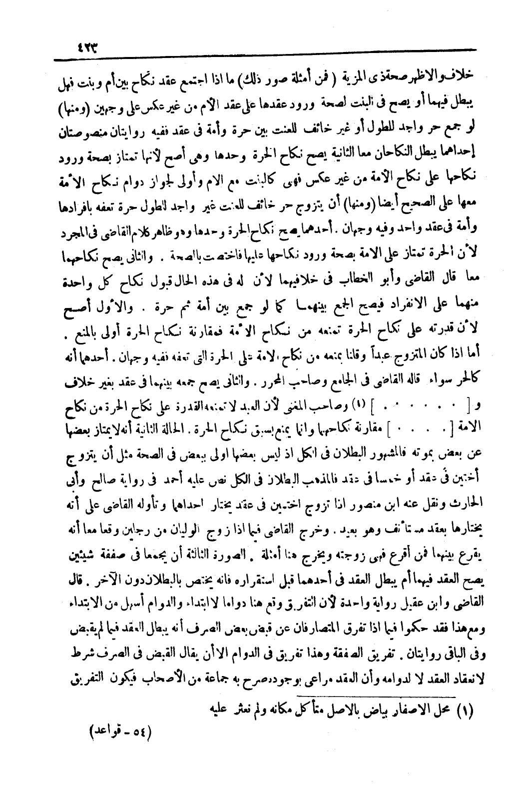(وَمِنْهَا) لَوْ جَمَعَ حُرٌّ وَاجِدٌ لِلطَّوْلِ أَوْ غَيْرُ خَائِفٍ لِلْعَنَتِ بَيْنَ حُرَّةٍ وَأَمَةٍ فِي عَقْدٍ، فَفِيهِ رِوَايَتَانِ مَنْصُوصَتَانِ: إحْدَاهُمَا يَبْطُلُ النِّكَاحَانِ مَعًا.