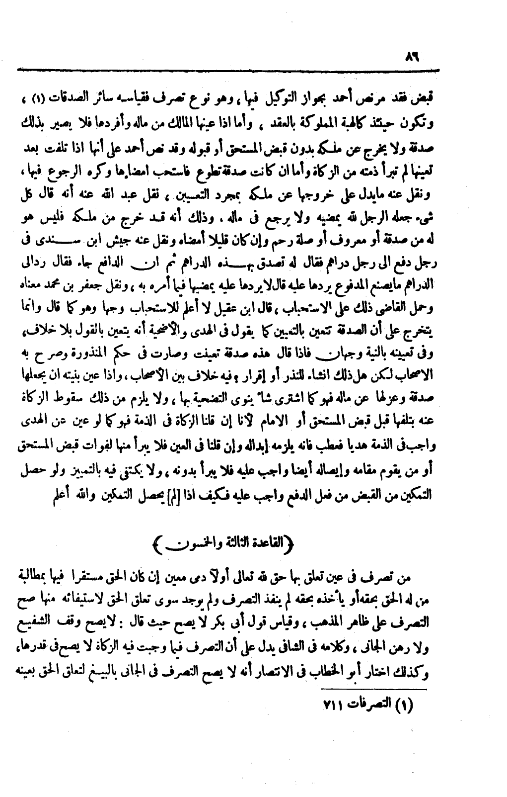 (الْقَاعِدَةُ الثَّالِثَةُ وَالْخَمْسُونَ) : مَنْ تَصَرَّفَ فِي عَيْنٍ تَعَلَّقَ بِهَا حَقٌّ لِلَّهِ تَعَالَى أَوْ لِآدَمِيٍّ مُعَيَّنٍ إنْ كَانَ الْحَقُّ مُسْتَقِرًّا فِيهَا بِمُطَالَبَةِ مَنْ لَهُ الْحَقُّ بِحَقِّهِ أَوْ يَأْخُذُهُ بِحَقِّهِ لَمْ يَنْفُذْ التَّصَرُّفُ وَلَمْ يُوجَدْ سِوَى تَعَلُّقِ الْحَقِّ لِاسْتِيفَائِهِ مِنْهَا صَحَّ التَّصَرُّفُ عَلَى ظَاهِرِ الْمَذْهَبِ، وَقِيَاسُ قَوْلِ أَبِي بَكْرٍ لَا يَصِحُّ حَيْثُ قَالَ: لَا يَصِحُّ وَقْفُ الشَّفِيعِ وَلَا رَهْنُ الْجَانِي، وَكَلَامُهُ فِي الشَّافِي يَدُلُّ عَلَى أَنَّ التَّصَرُّفَ فِيمَا وَجَبَتْ فِيهِ الزَّكَاةُ لَا يَصِحُّ فِي قَدْرِهَا، وَكَذَلِكَ اخْتَارَ أَبُو الْخَطَّابِ فِي الِانْتِصَارِ أَنَّهُ لَا يَصِحُّ التَّصَرُّفُ فِي الْجَانِي بِالْبَيْعِ لِتَعَلُّقِ الْحَقِّ بِعَيْنِهِ