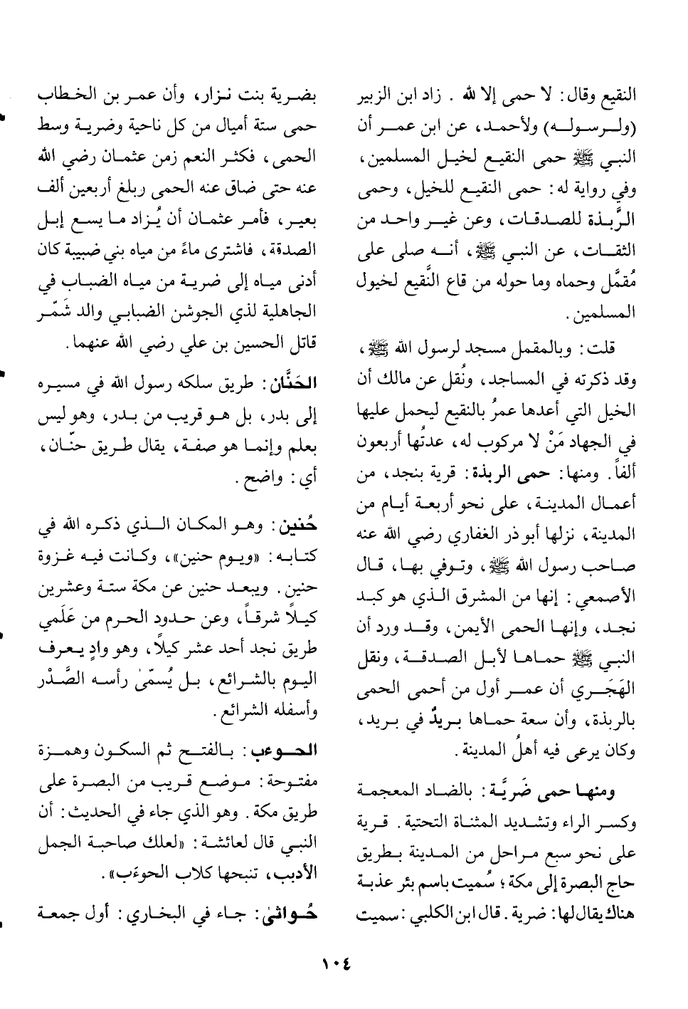 قلت: وبالمقمل مسجد لرسول الله صلّى الله عليه وسلّم، وقد ذكرته في المساجد، ونقل عن مالك أن الخيل التي أعدها عمر بالنقيع ليحمل عليها في الجهاد من لا مركوب له، عدتها أربعون ألفا. ومنها: حمى الربذة: قرية بنجد، من أعمال المدينة، على نحو أربعة أيام من المدينة، نزلها أبو ذر الغفاري رضي الله عنه صاحب رسول الله صلّى الله عليه وسلّم، وتوفي بها، قال الأصمعي: إنها من المشرق الذي هو كبد نجد، وإنها الحمى الأيمن، وقد ورد أن النبي صلّى الله عليه وسلّم حماها لأبل الصدقة، ونقل الهجري أن عمر أول من أحمى الحمى بالربذة، وأن سعة حماها بريد في بريد، وكان يرعى فيه أهل المدينة.
