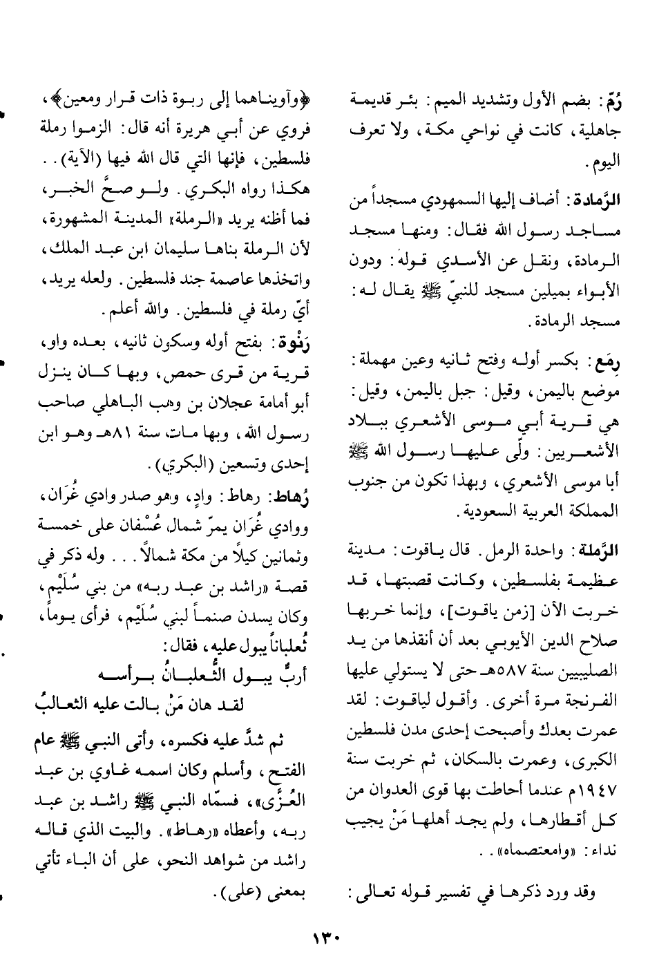 واحدة الرمل. قال ياقوت: مدينة عظيمة بفلسطين، وكانت قصبتها، قد خربت الان [زمن ياقوت] ، وإنما خربها صلاح الدين الأيوبي بعد أن أنقذها من يد الصليبيين سنة 587 هـ حتى لا يستولي عليها الفرنجة مرة أخرى. وأقول لياقوت: لقد عمرت بعدك وأصبحت إحدى مدن فلسطين الكبرى، وعمرت بالسكان، ثم خربت سنة 1947 م عندما أحاطت بها قوى العدوان من كل أقطارها، ولم يجد أهلها من يجيب نداء: «وا معتصماه» .